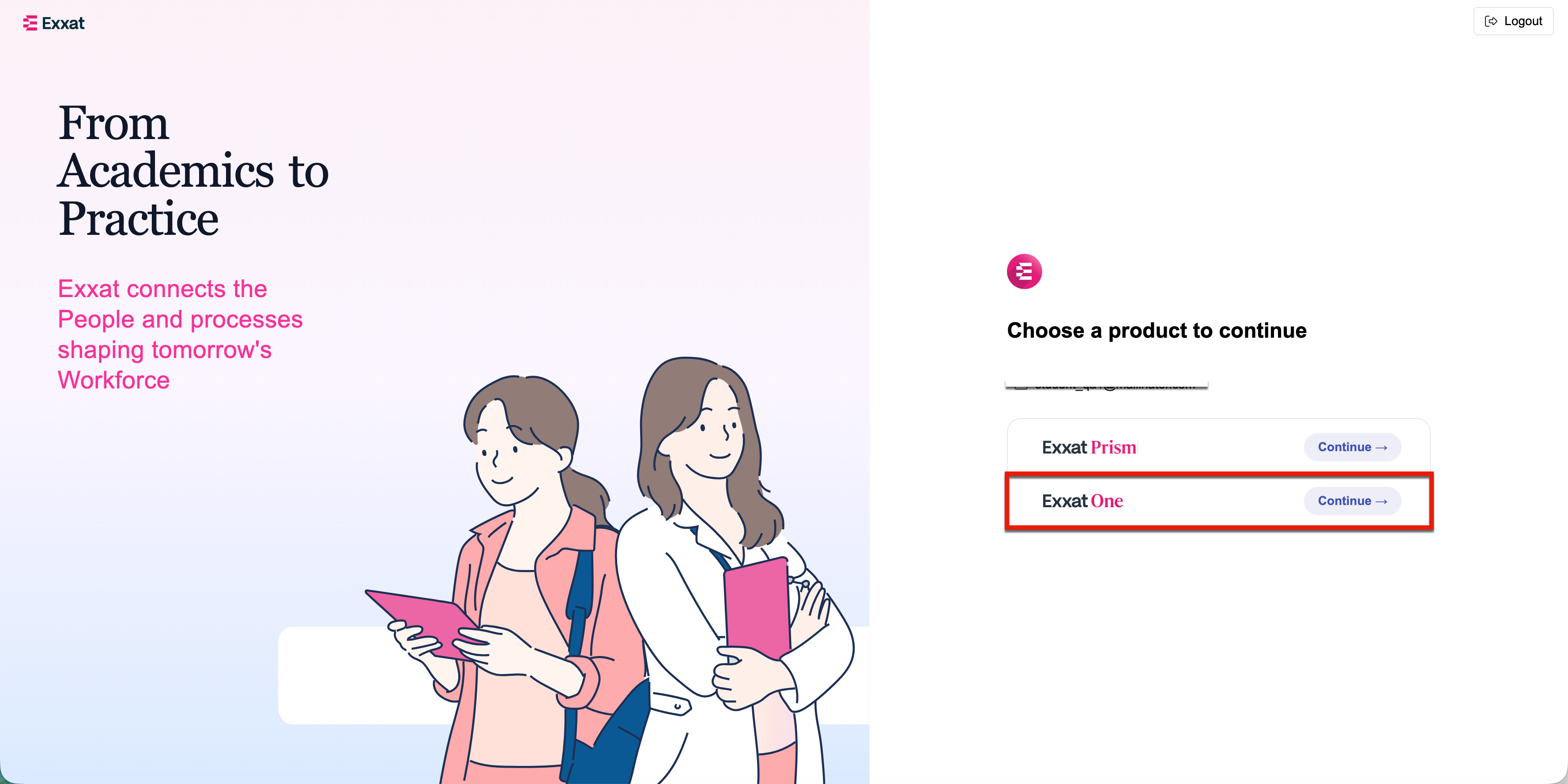 To access Exxat One, click Continue on the Exxat One tile to log in to Exxat One.