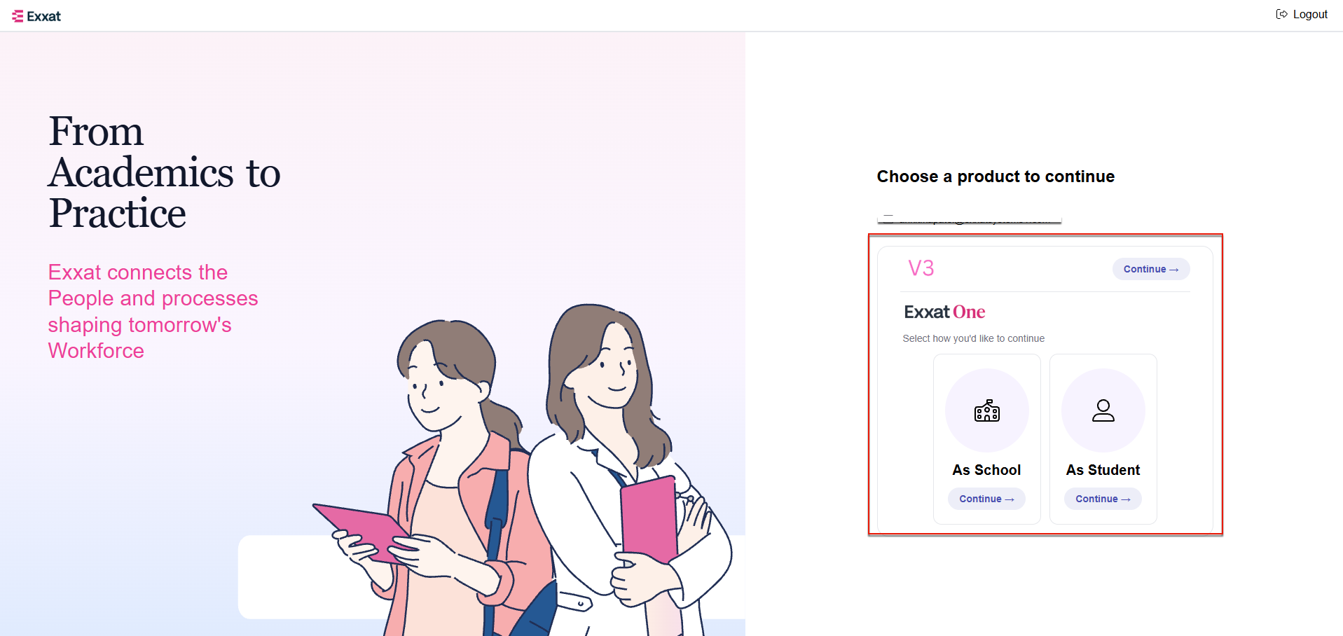 - You will be directed to a landing page with two tiles: V3 and Exxat One.