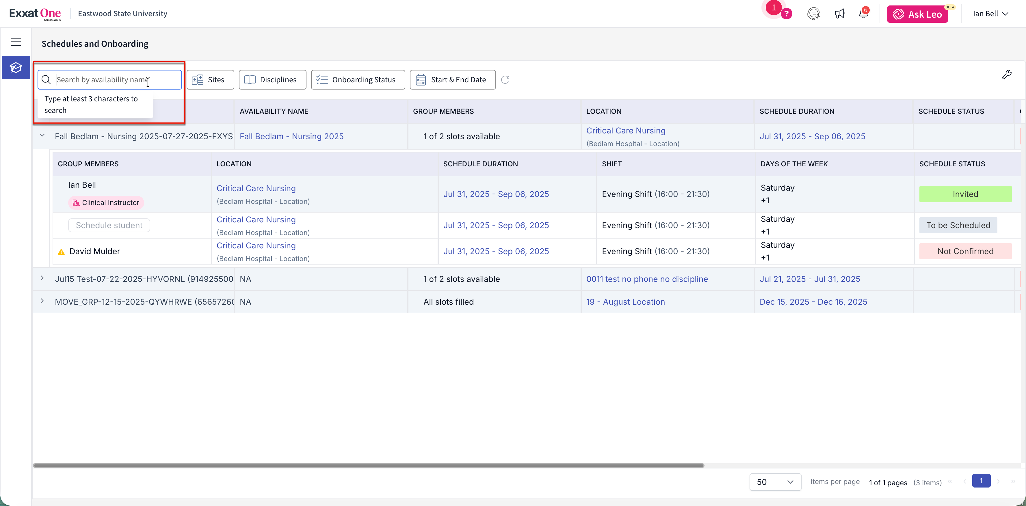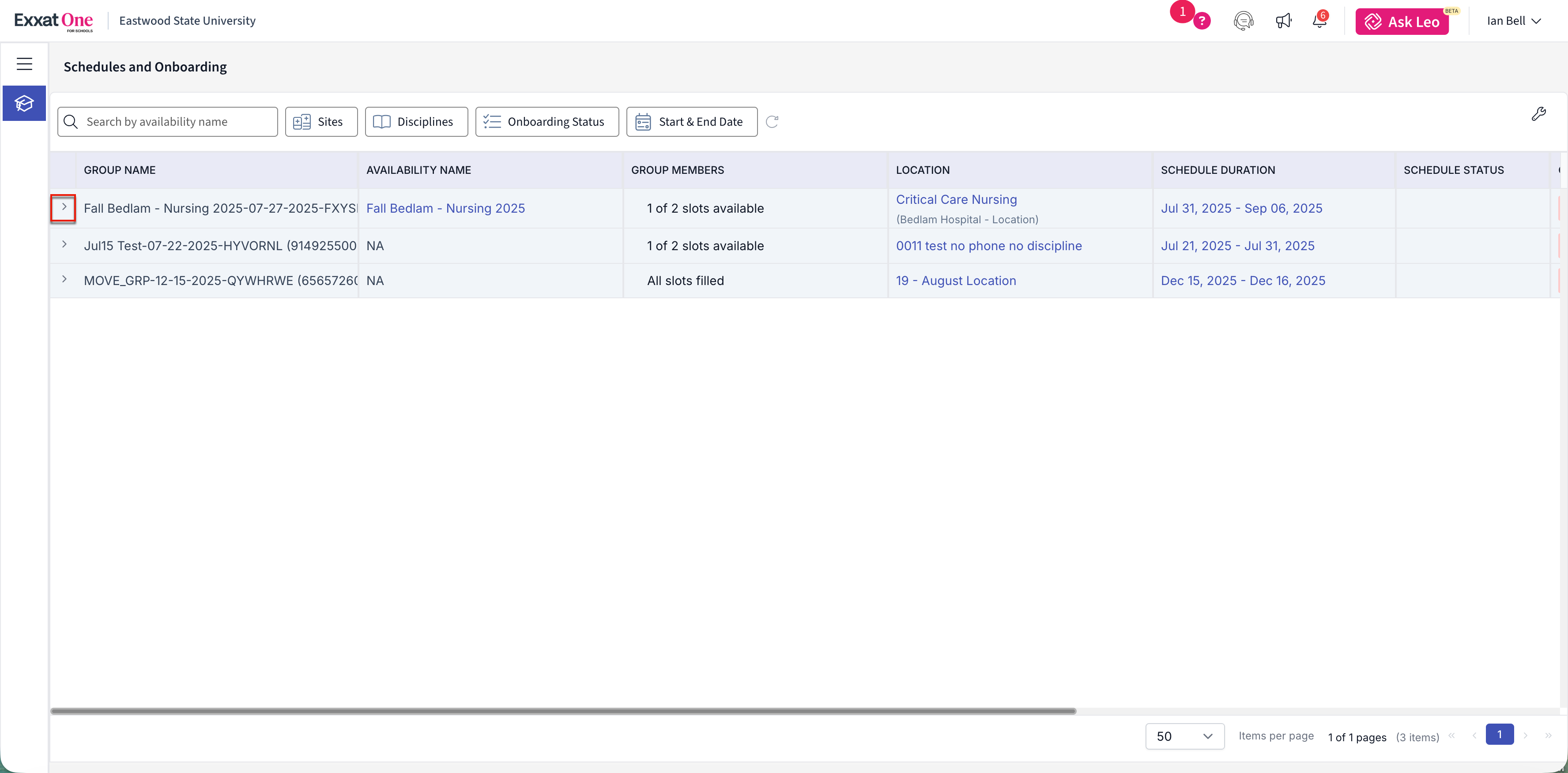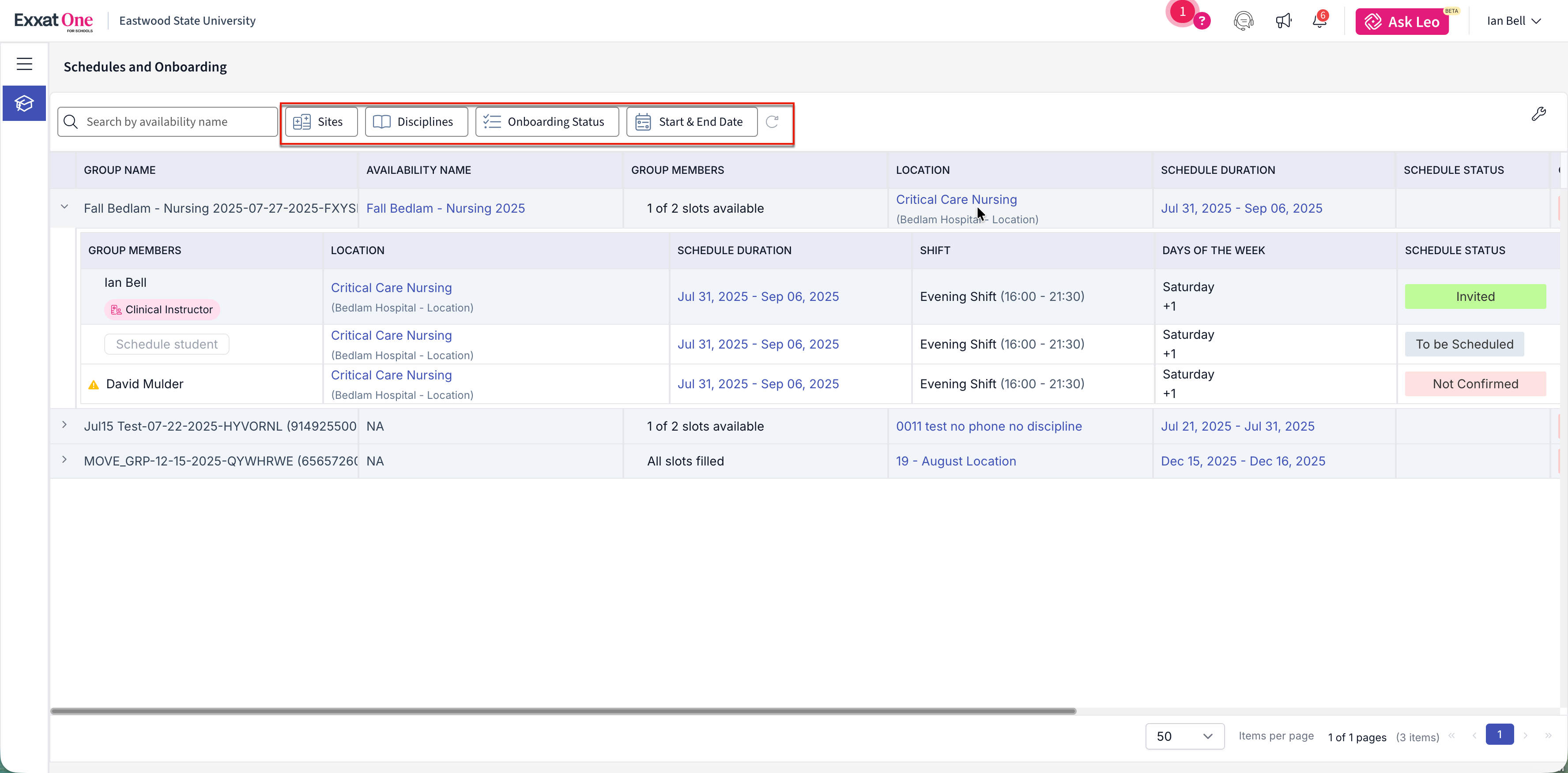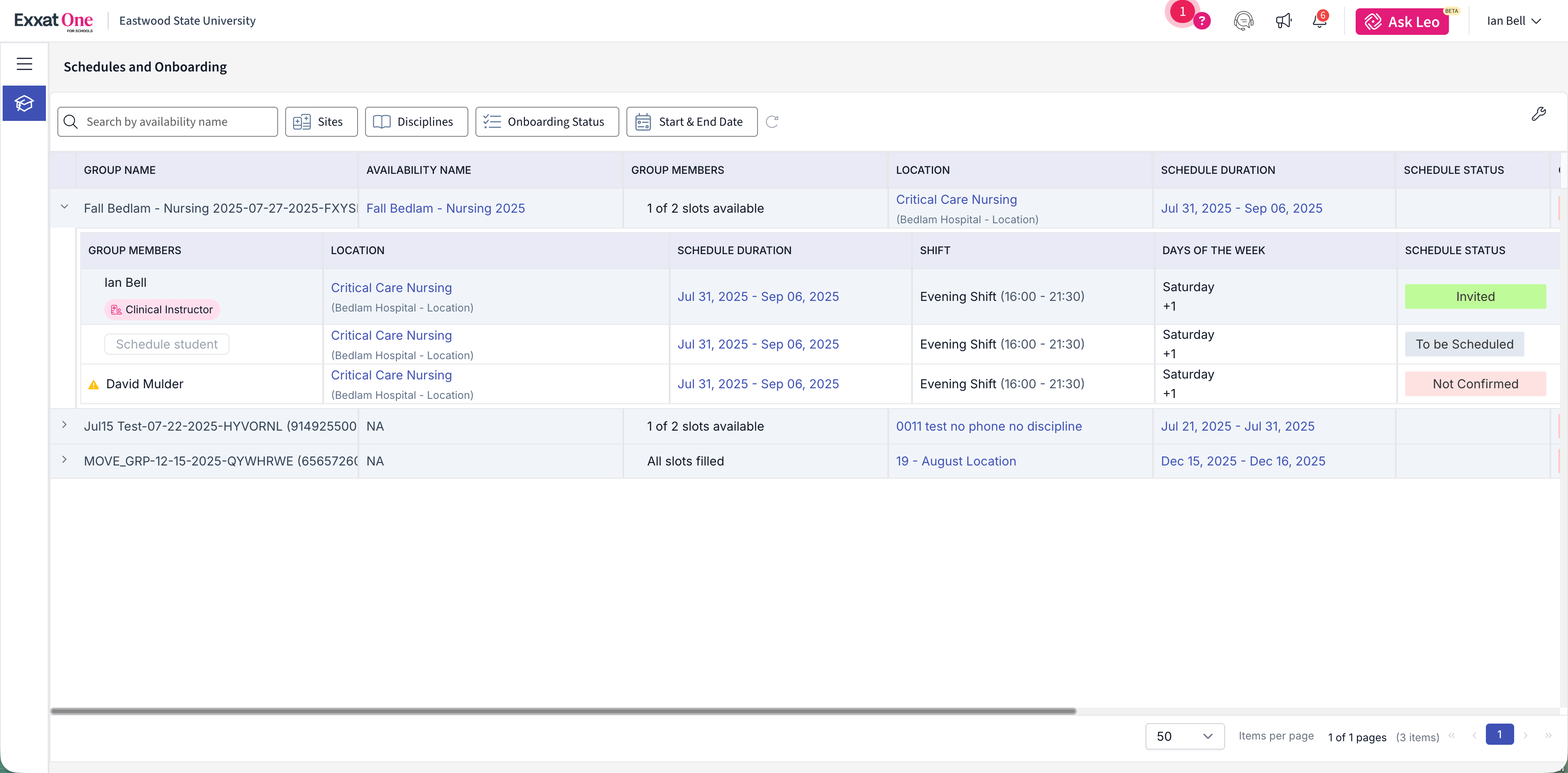 - Open the onboarding panel from the Schedules and Onboarding page and select your name under Clinical Instructor.