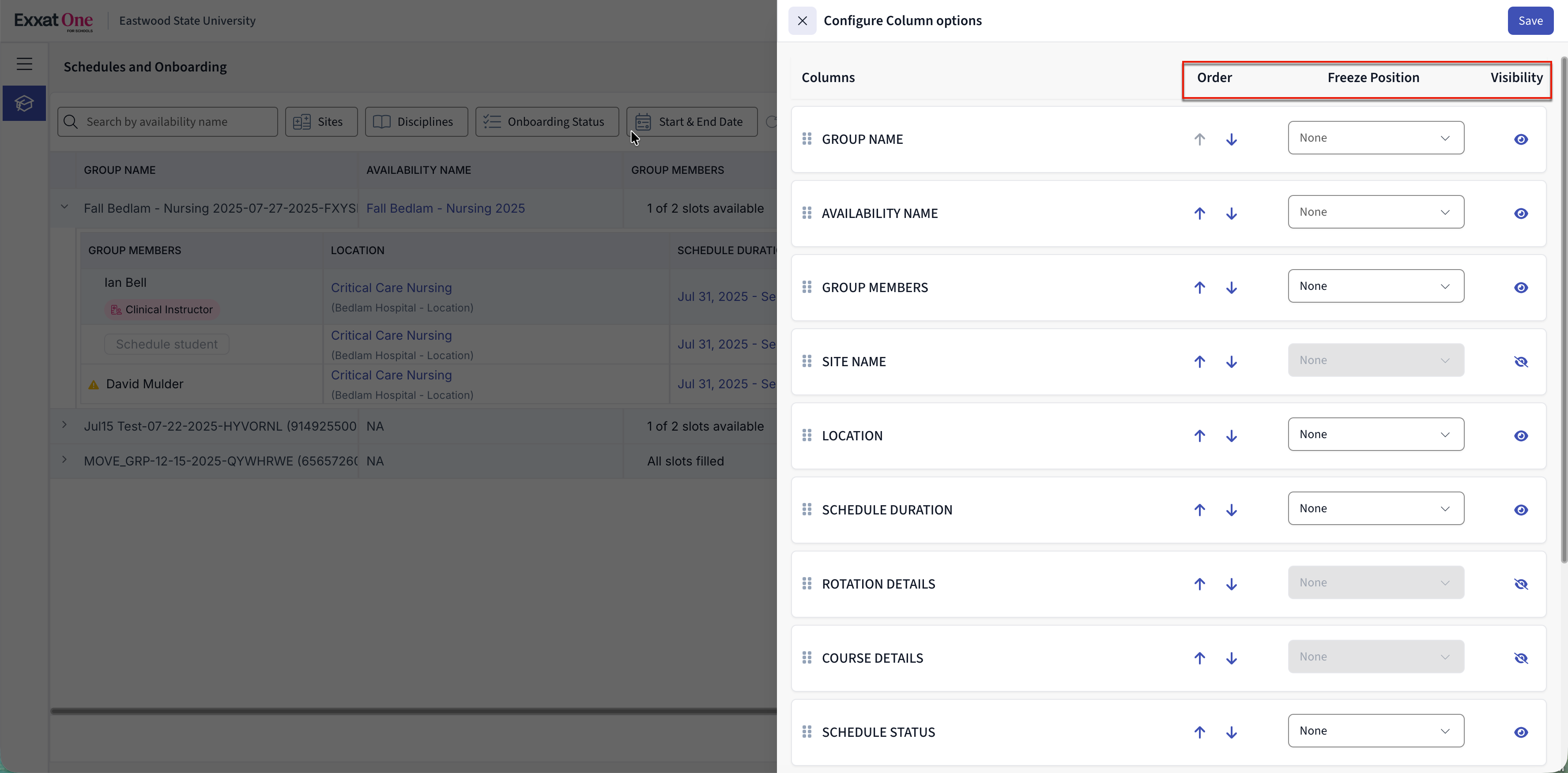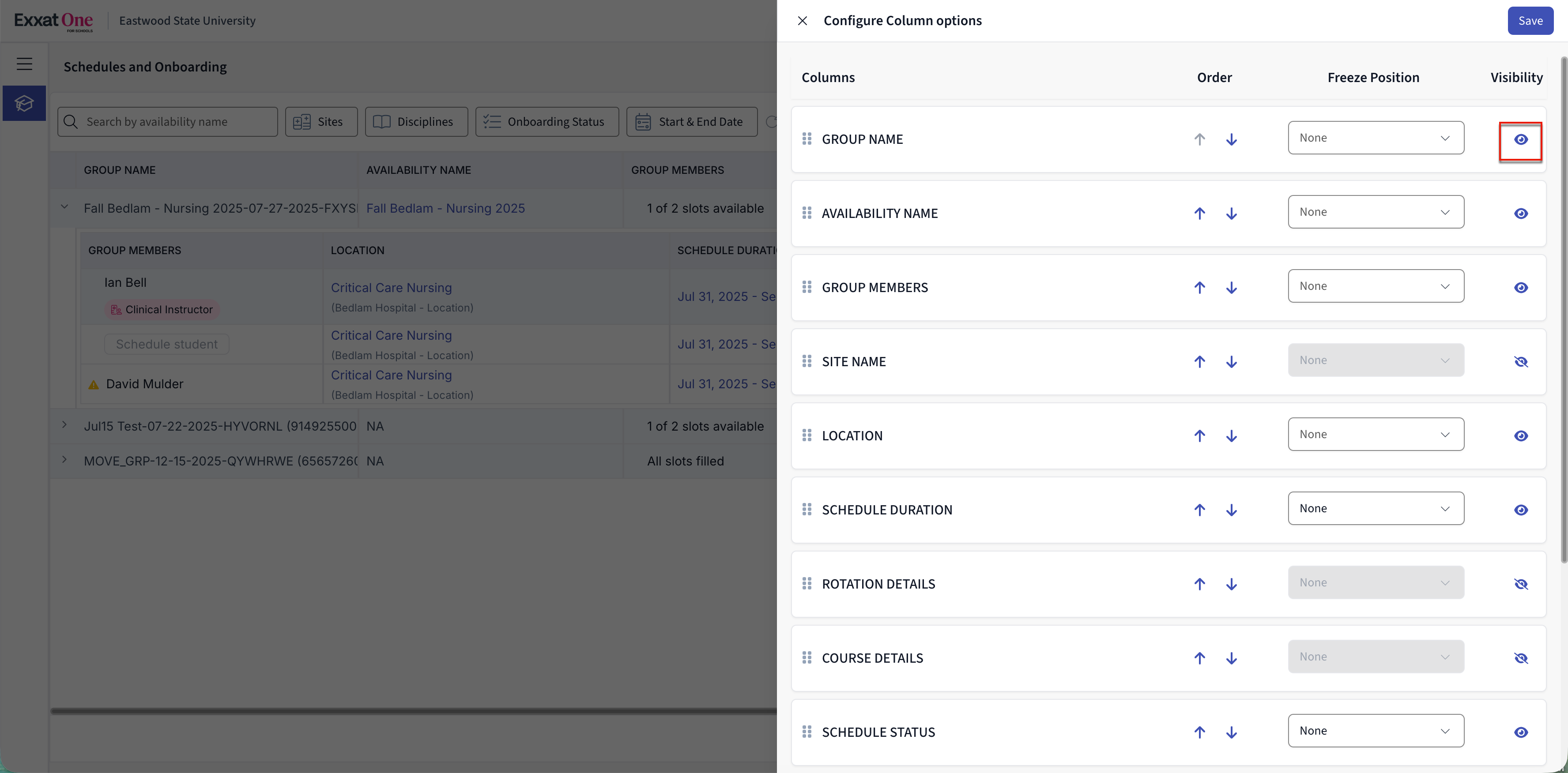 - Use the Visibility (eye) icon on the far right of each column row to show or hide columns.