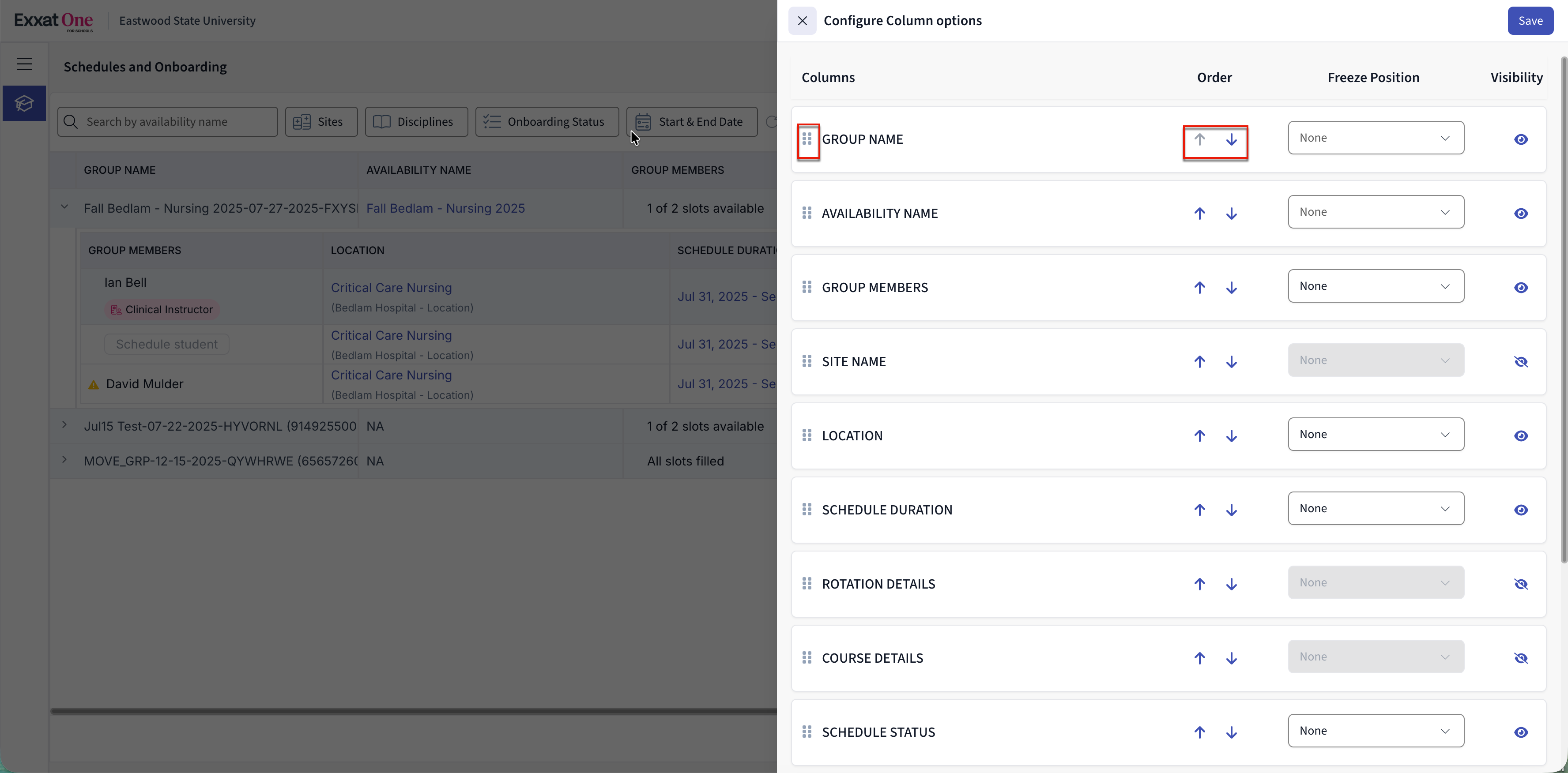 - Use the drag handles on the left side of each row to drag and rearrange columns.