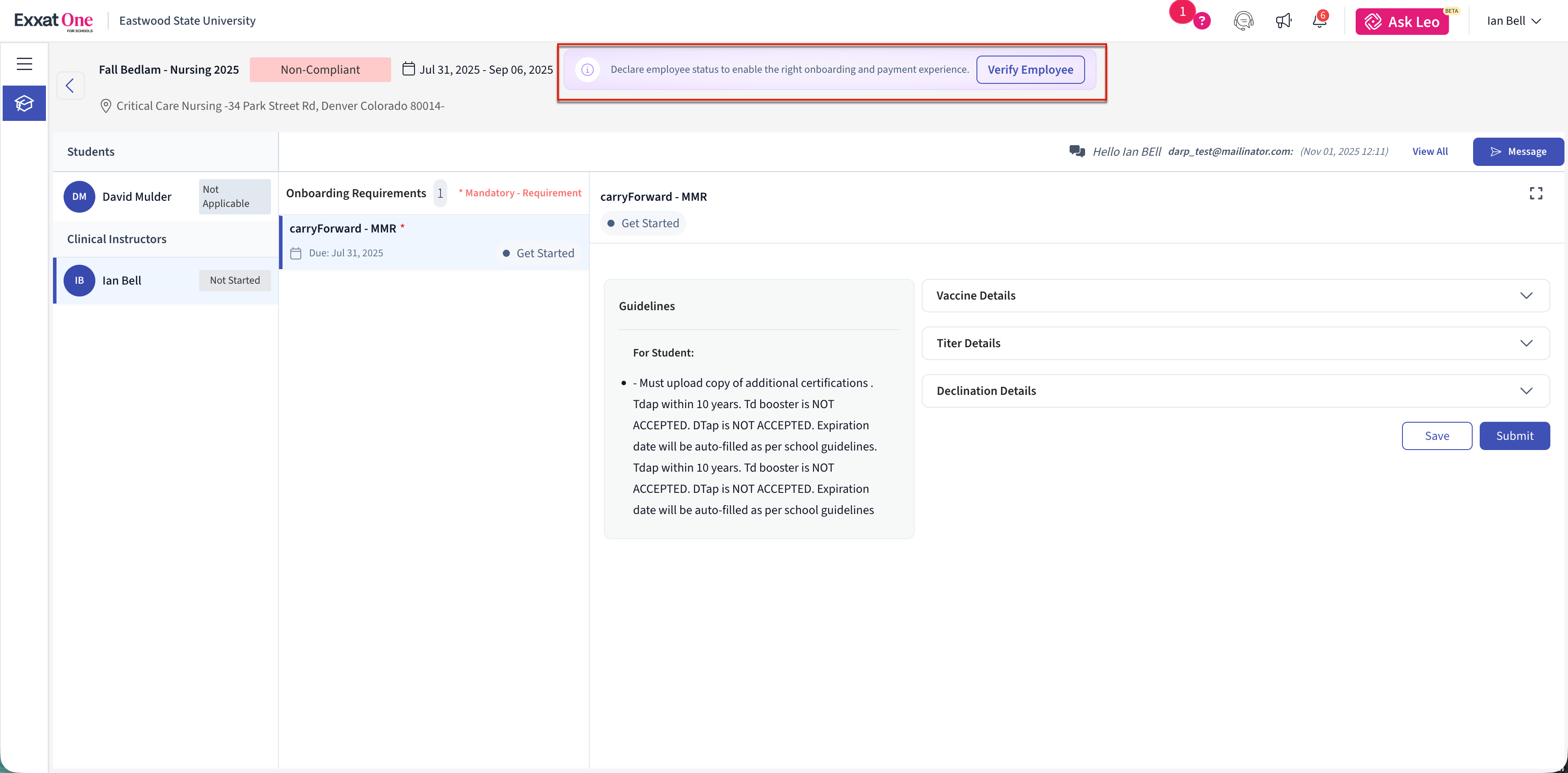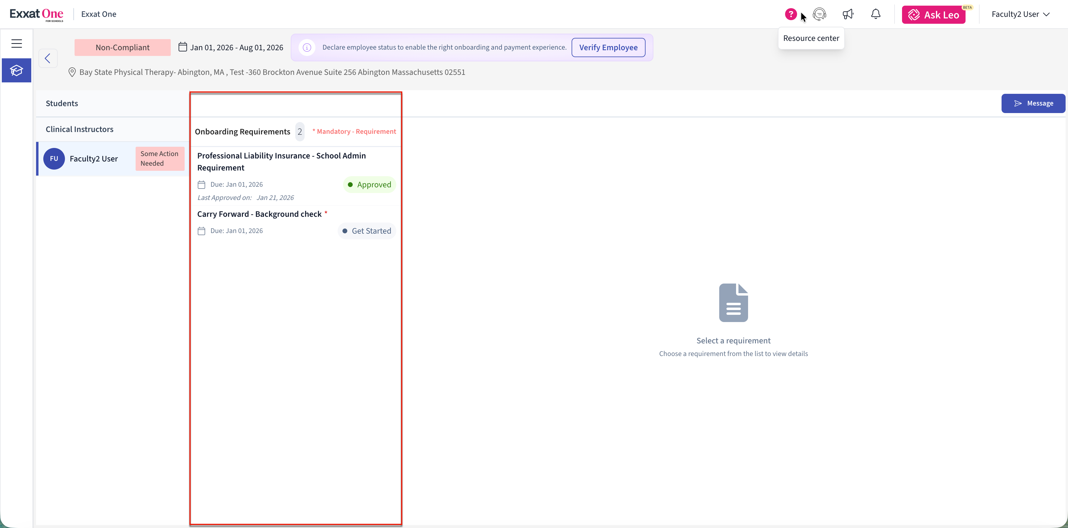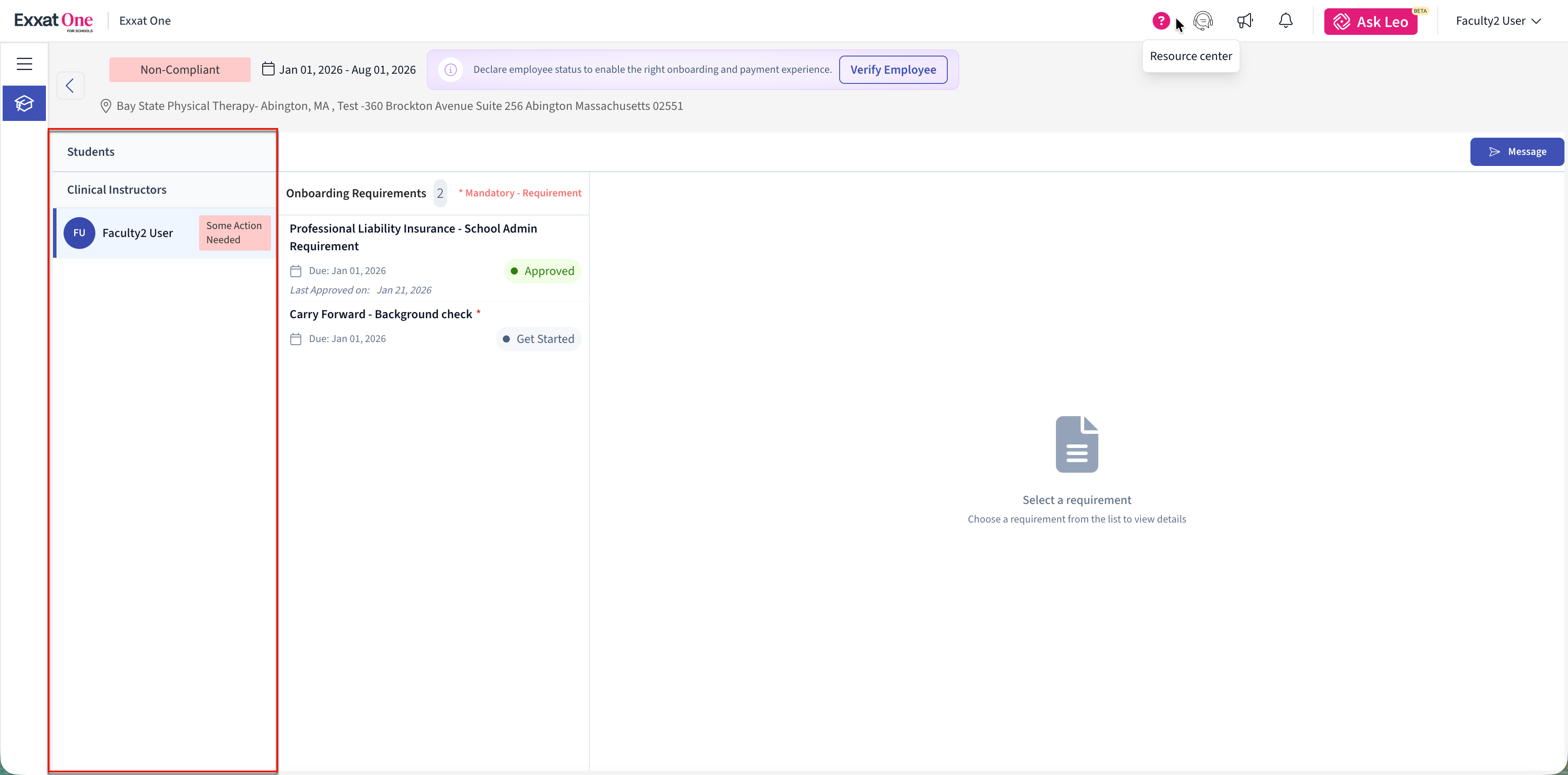 - Click on your own name under Clinical Instructors to view and complete your own onboarding requirements (if applicable).