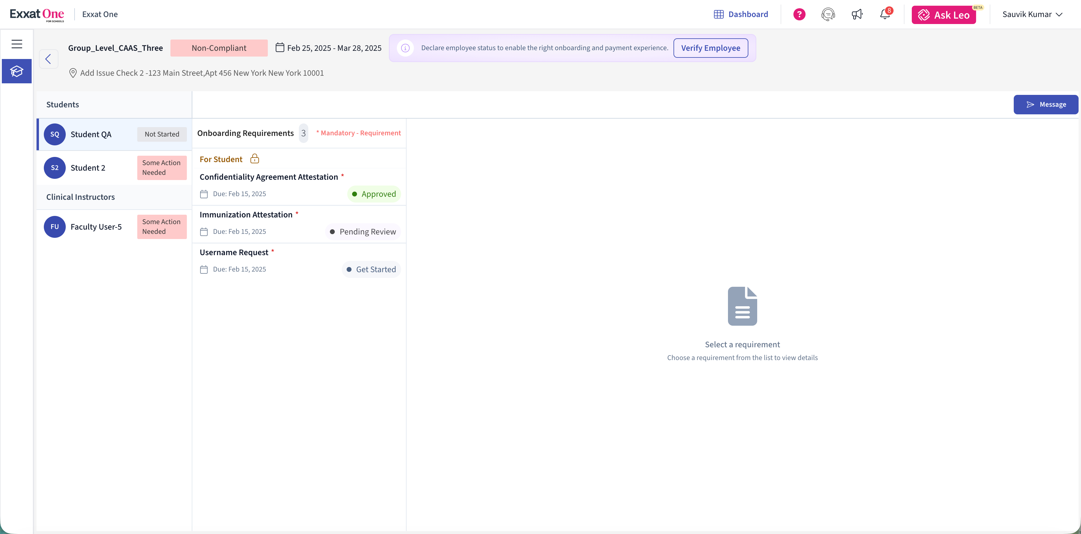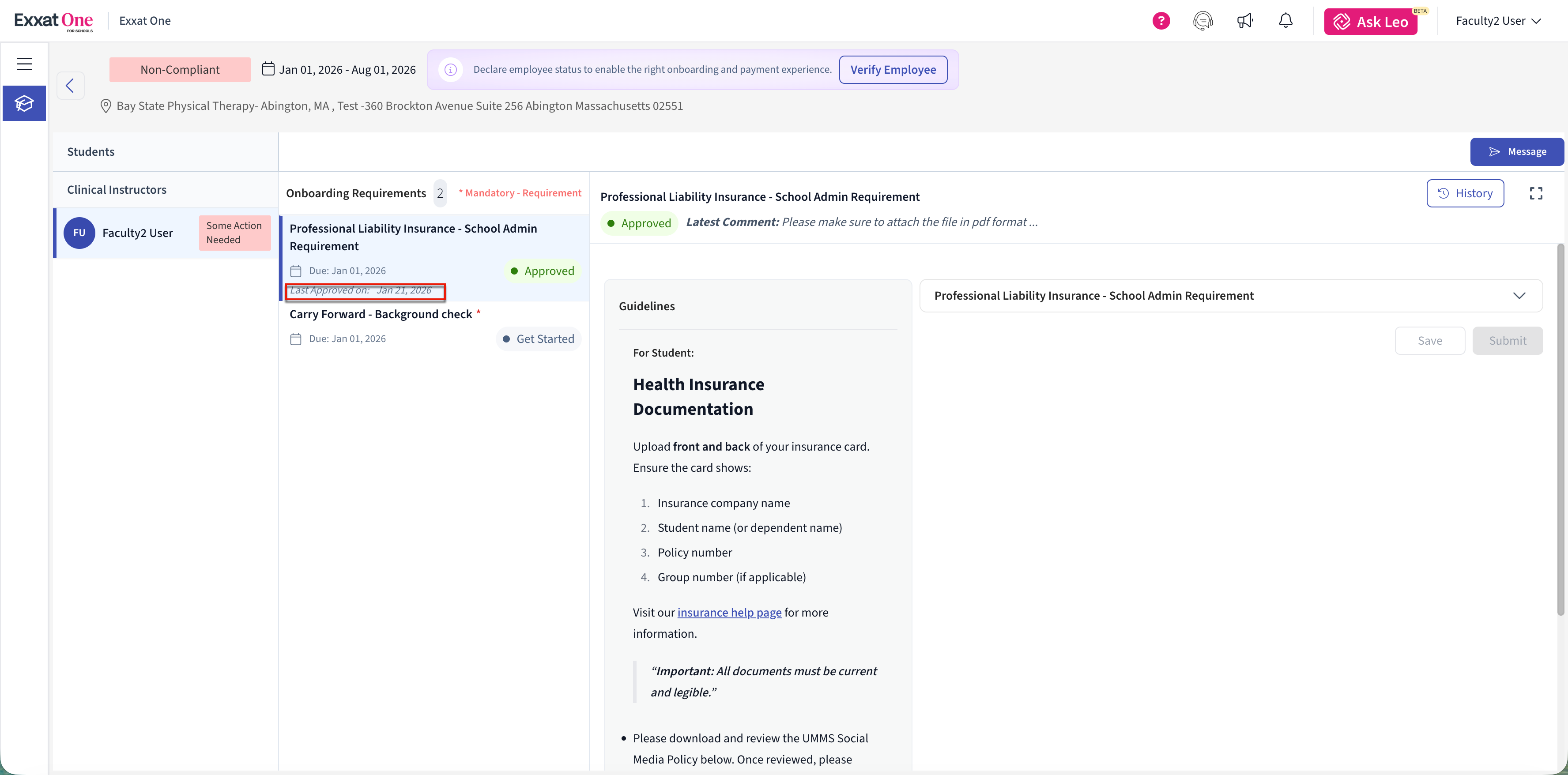 - Compliant - The student has completed all onboarding requirements, and all items have been reviewed and approved.