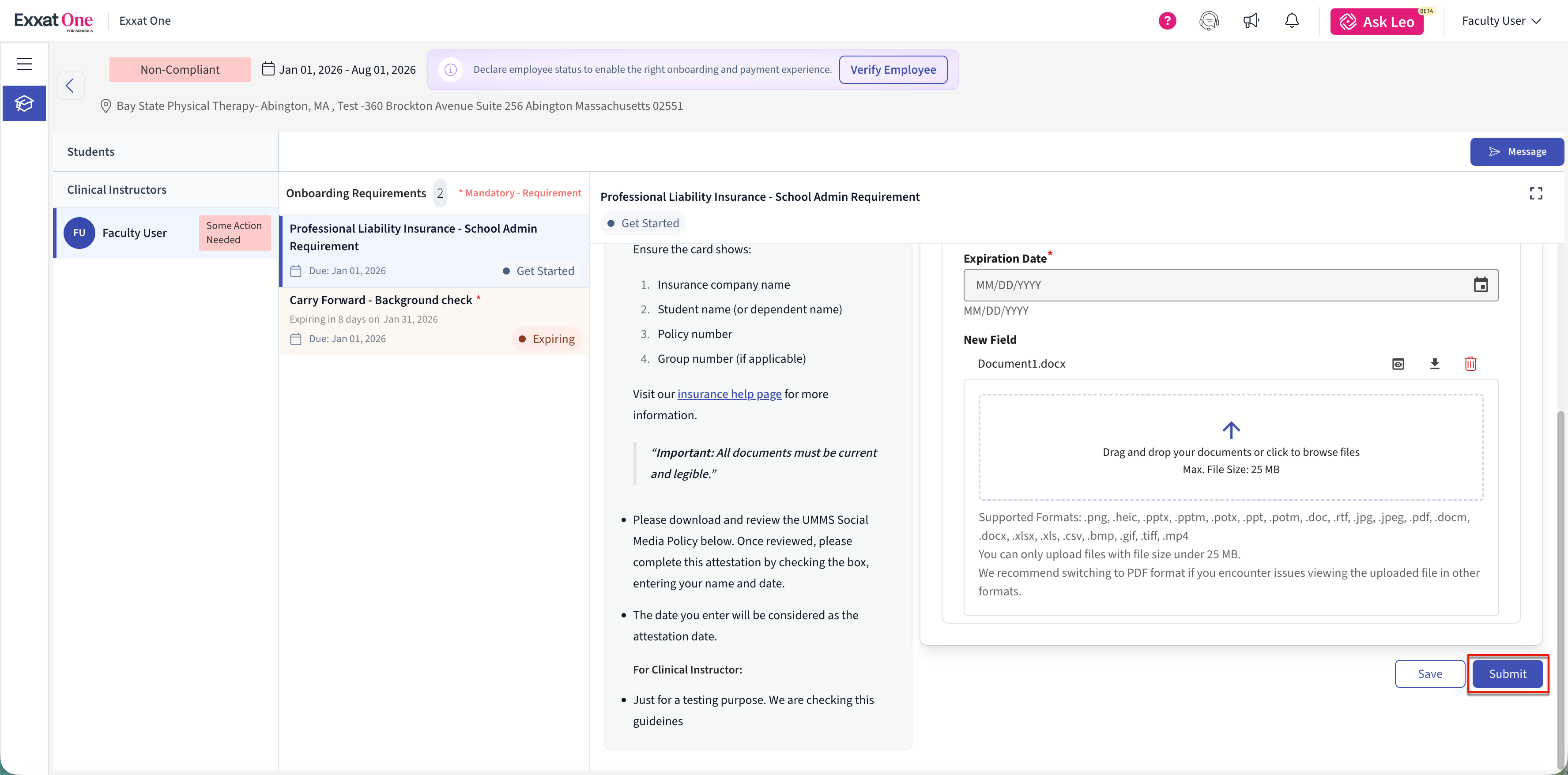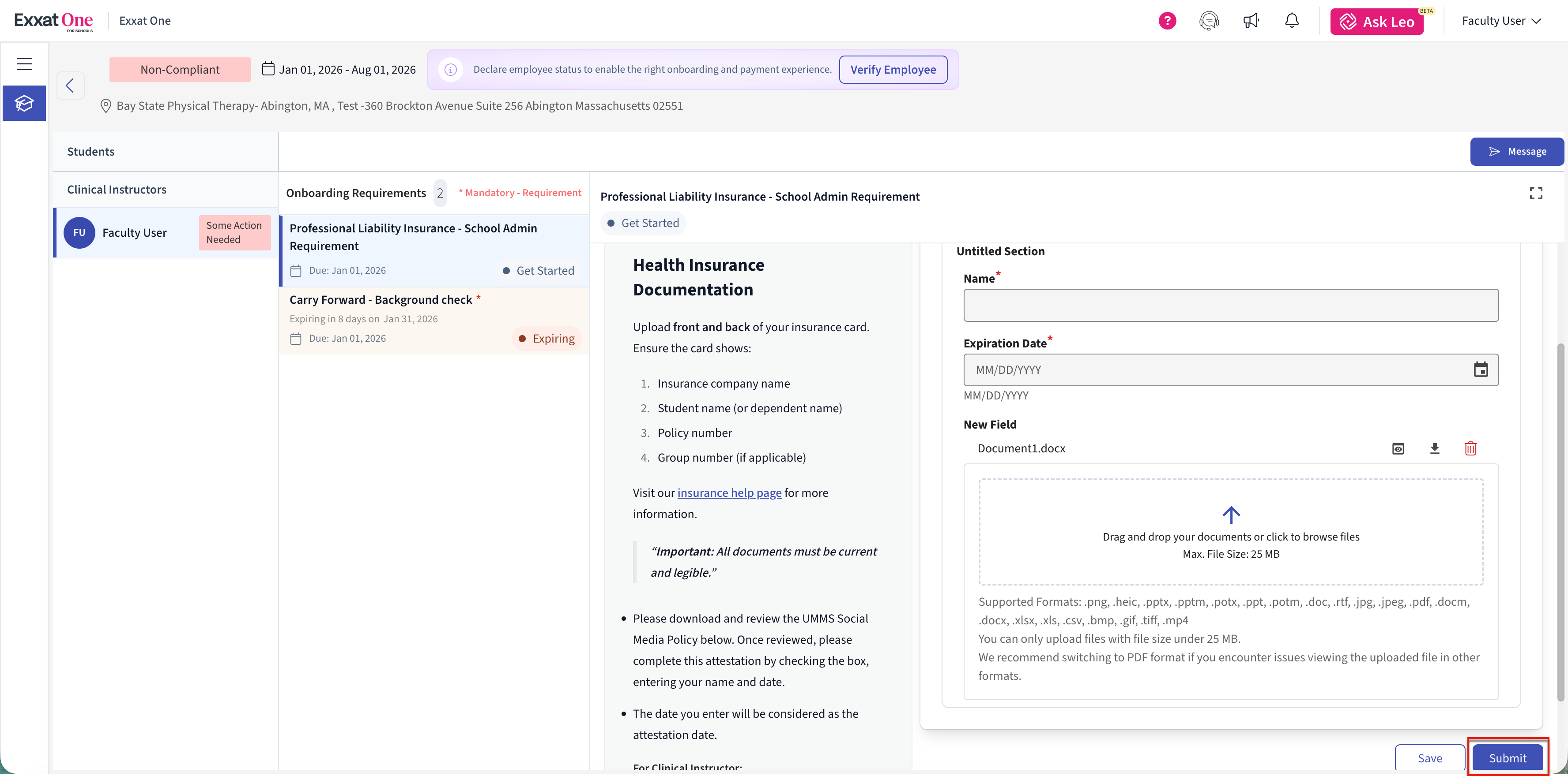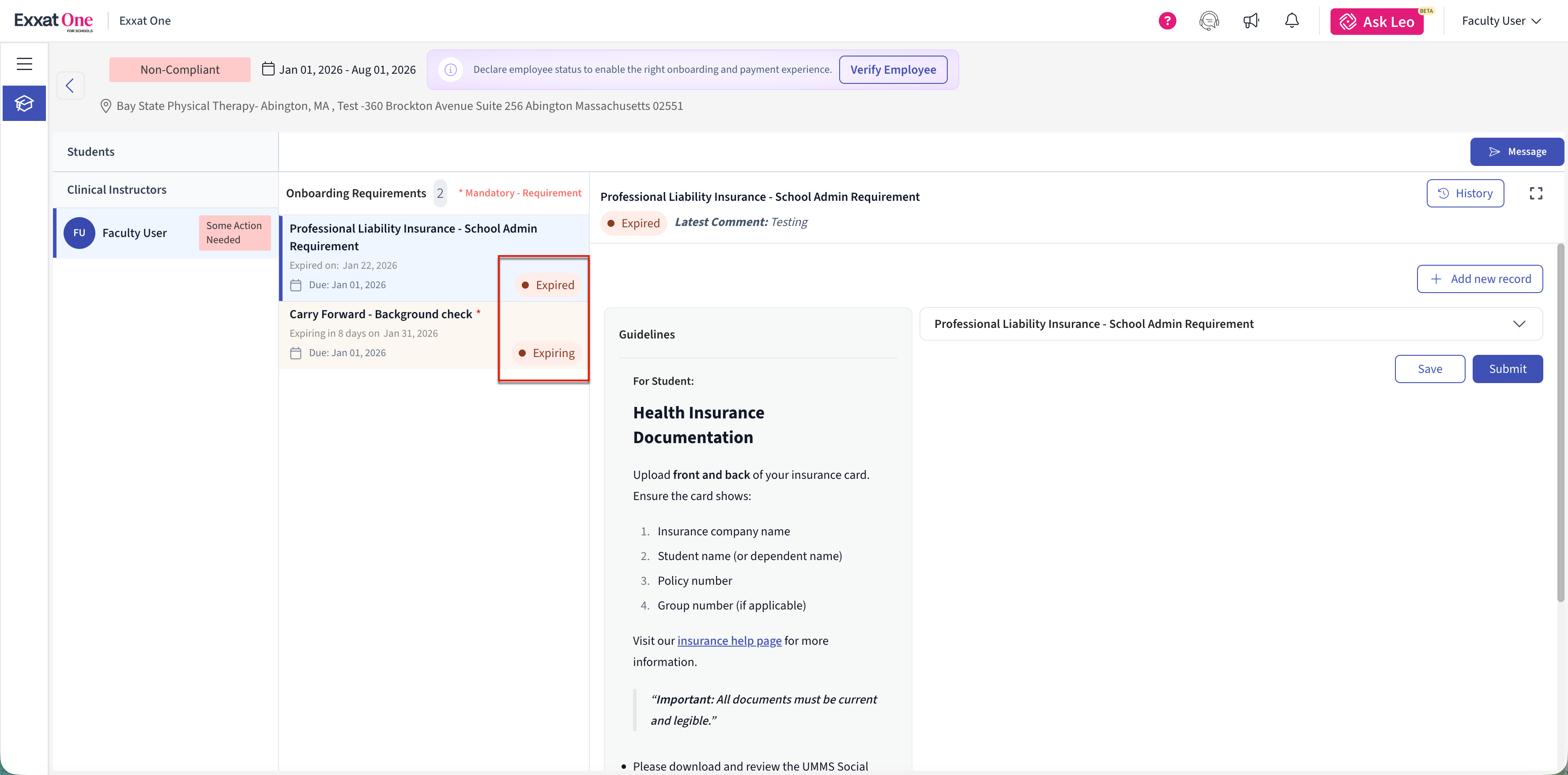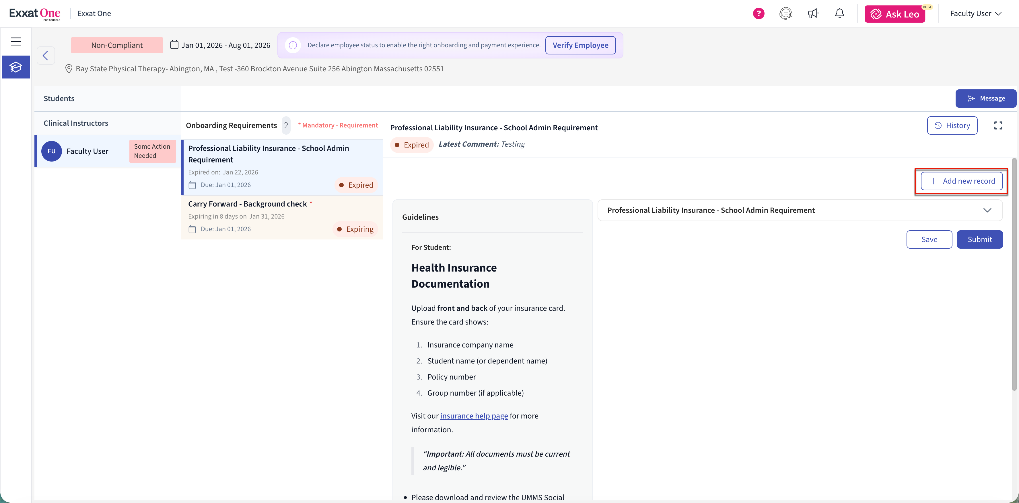 Clinical Instructors can update their own expiring or expired onboarding requirements.