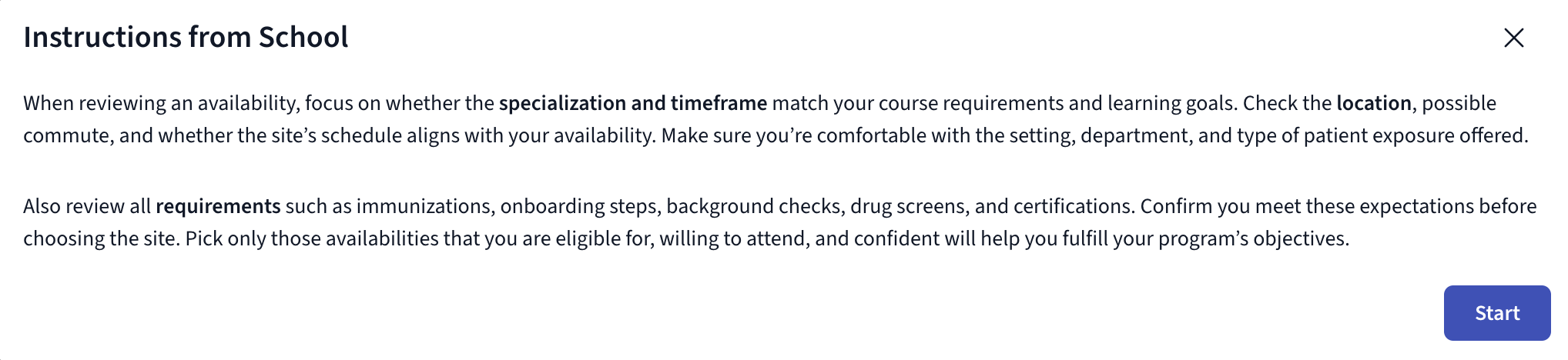 Before the wishlist submission flow starts, instructions provided by your school are displayed. These instructions are intended to guide you on how to evaluate and select availabilities.