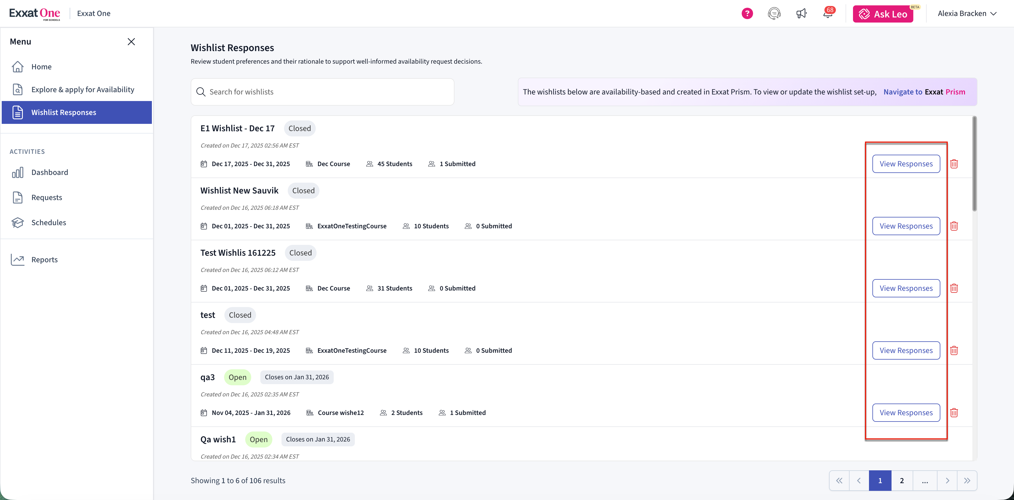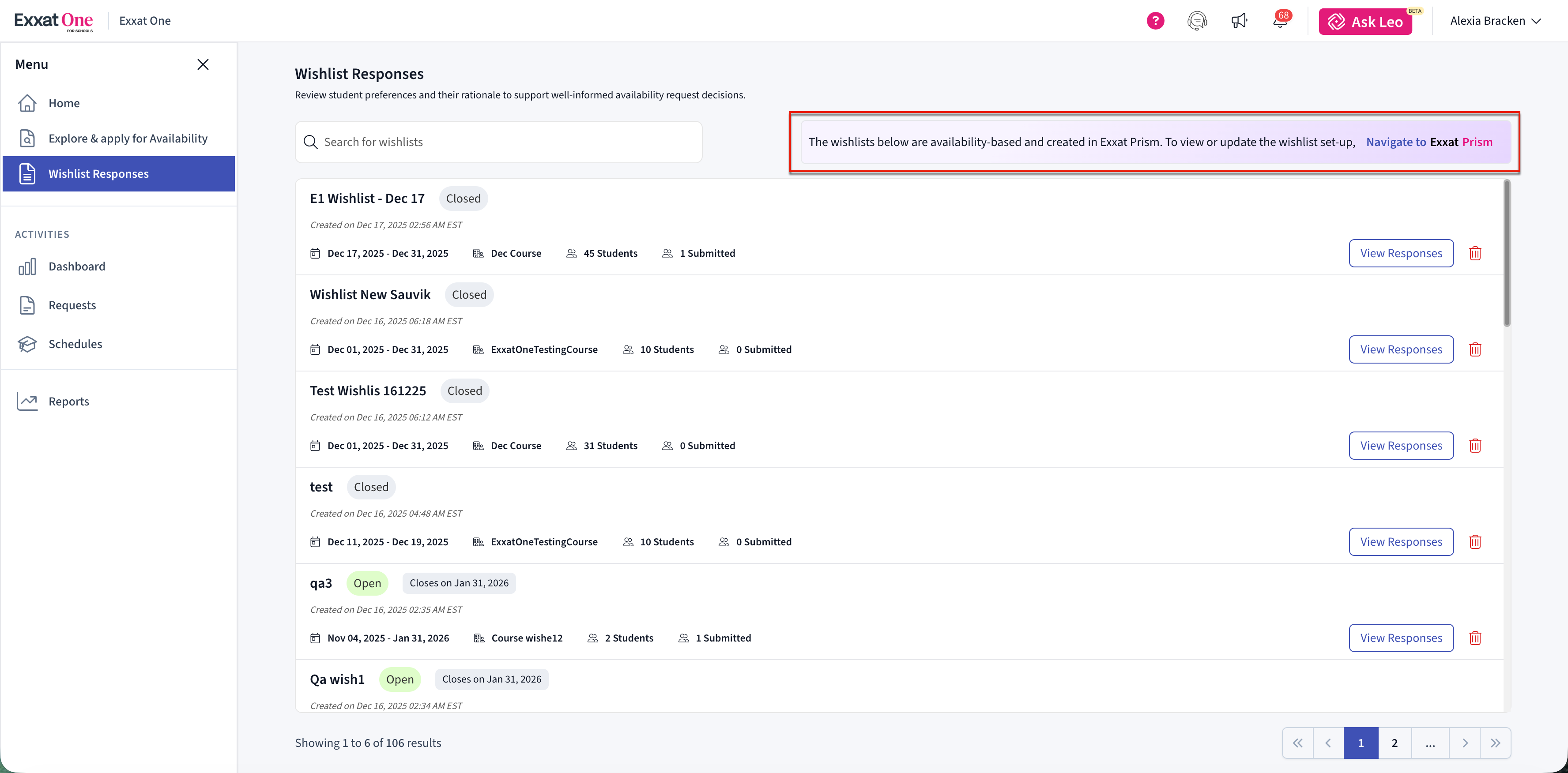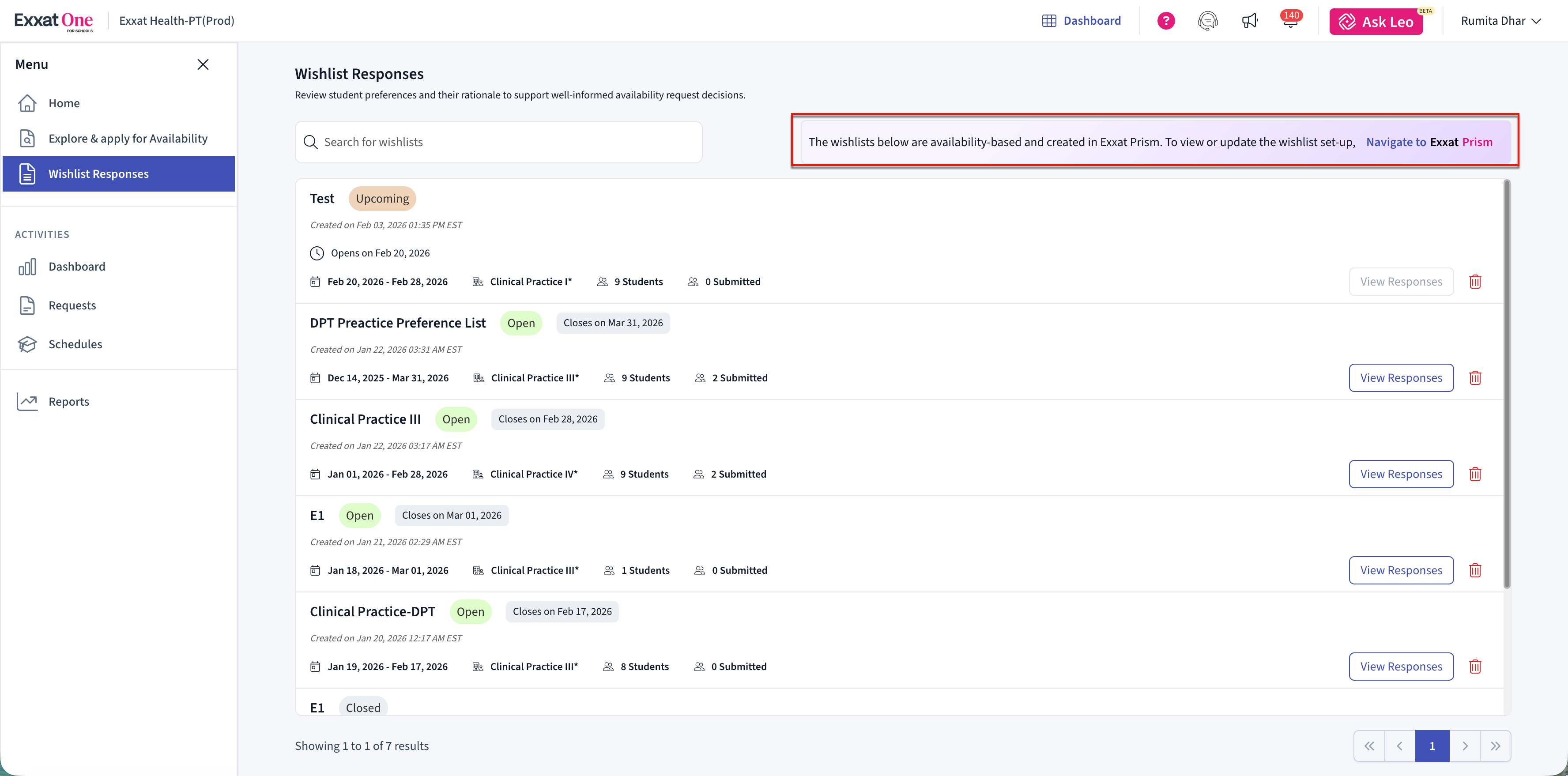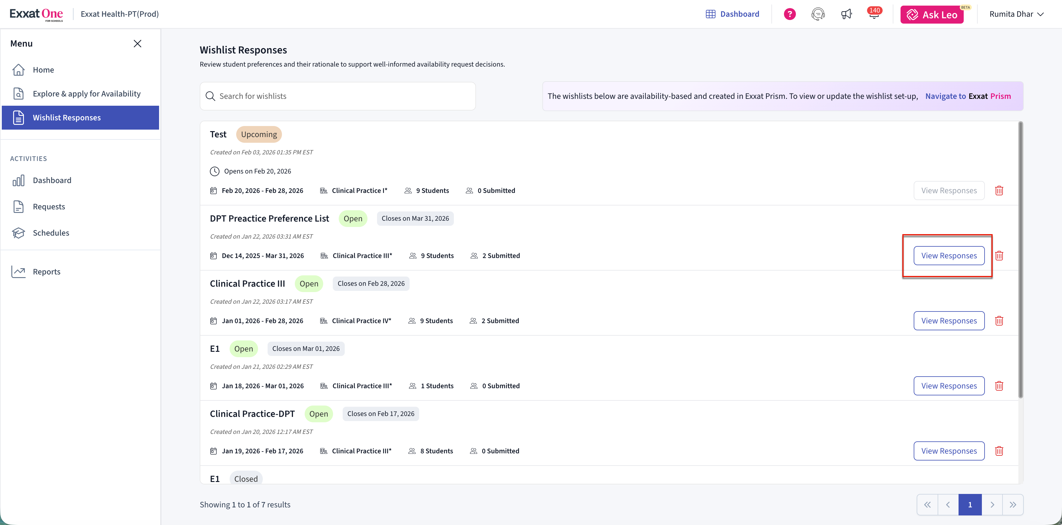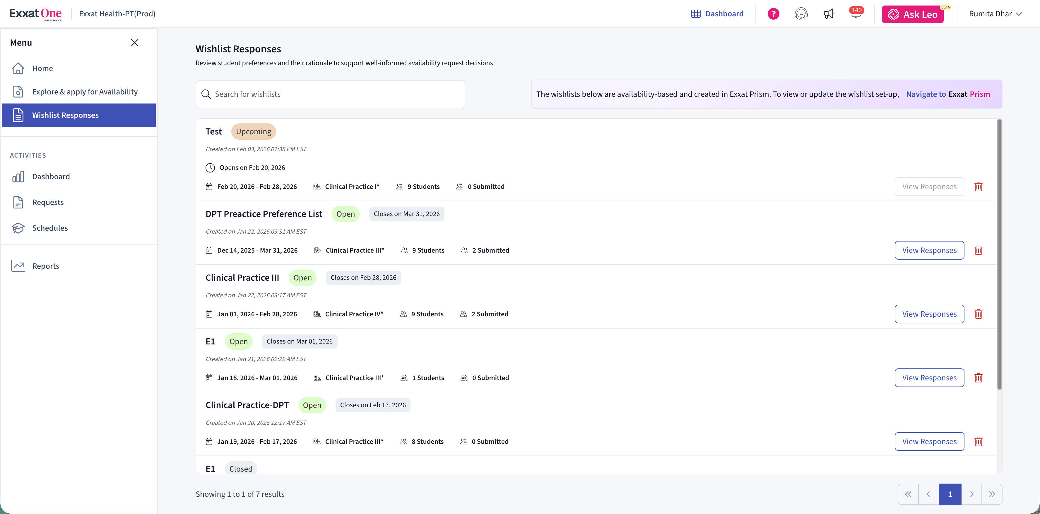 The Wishlist Responses page displays all wishlists created in Exxat Prism that are currently active or closed.