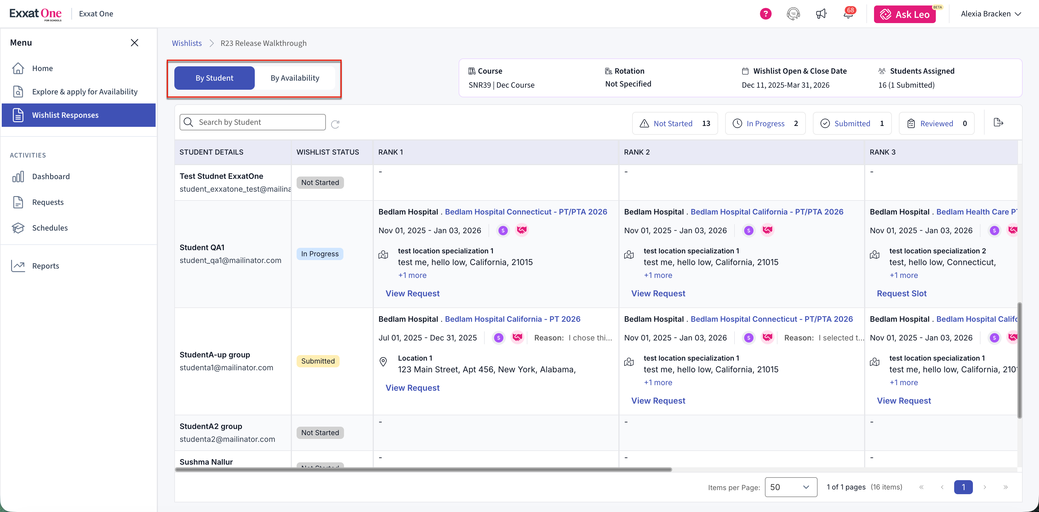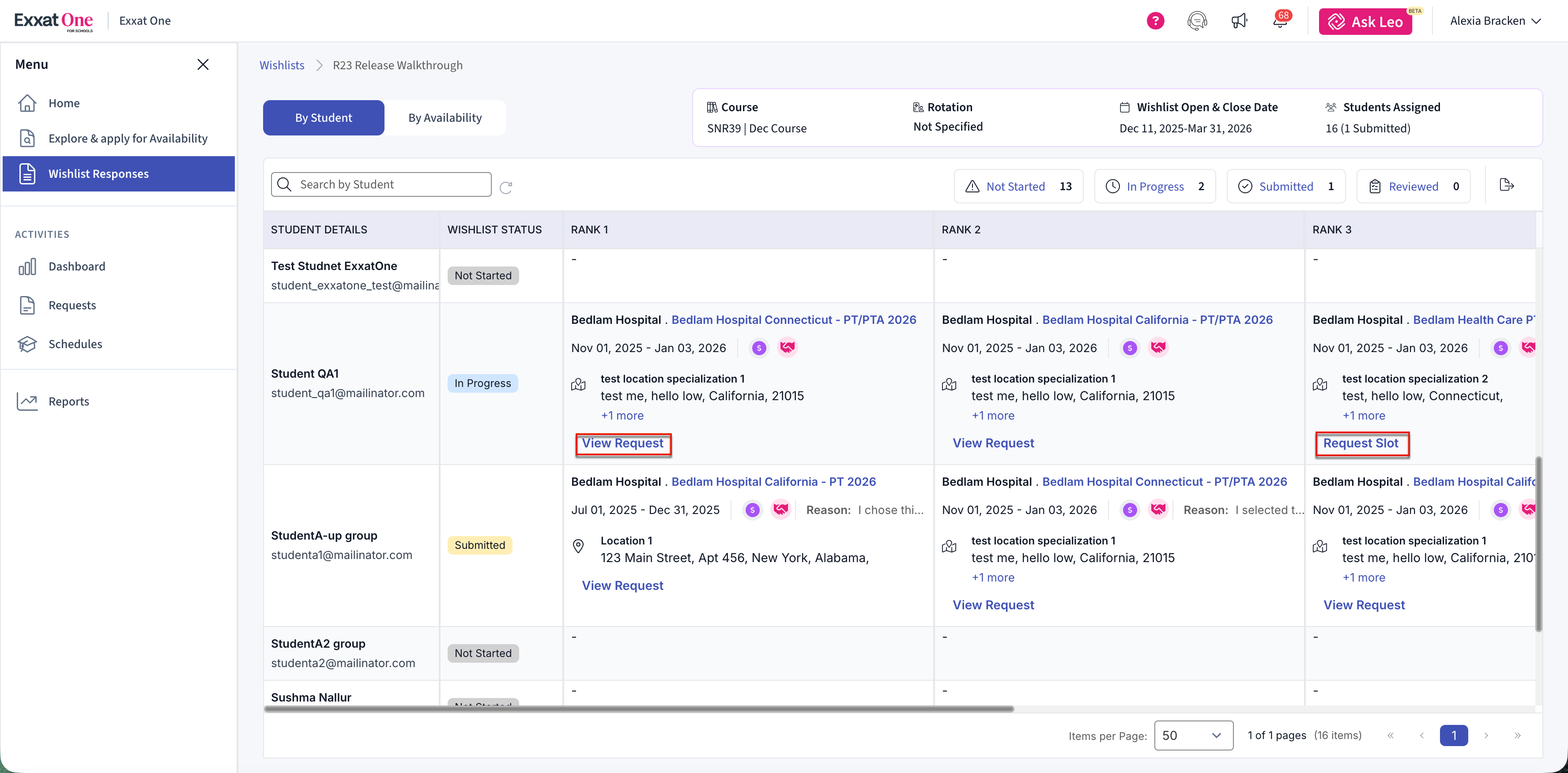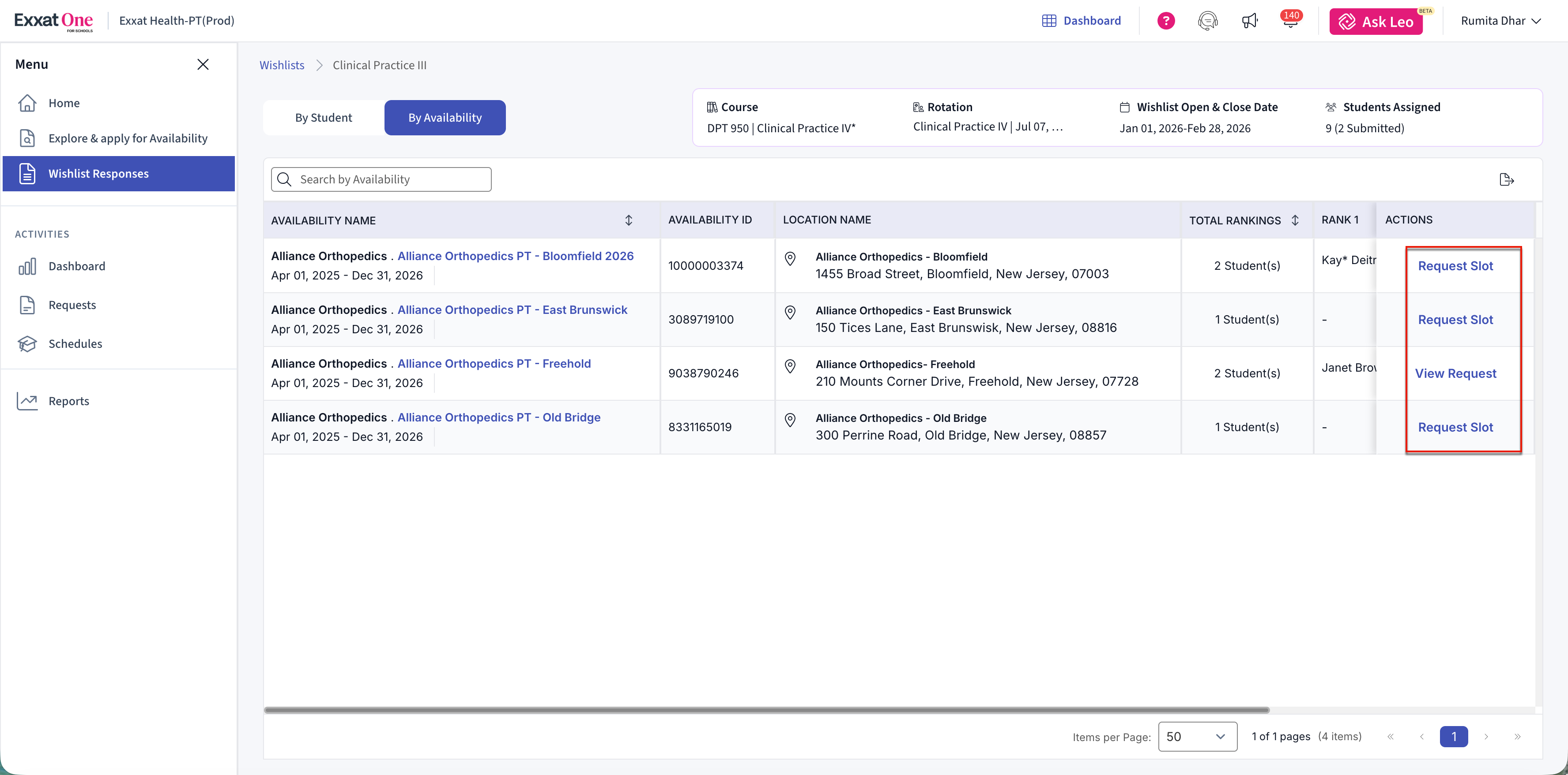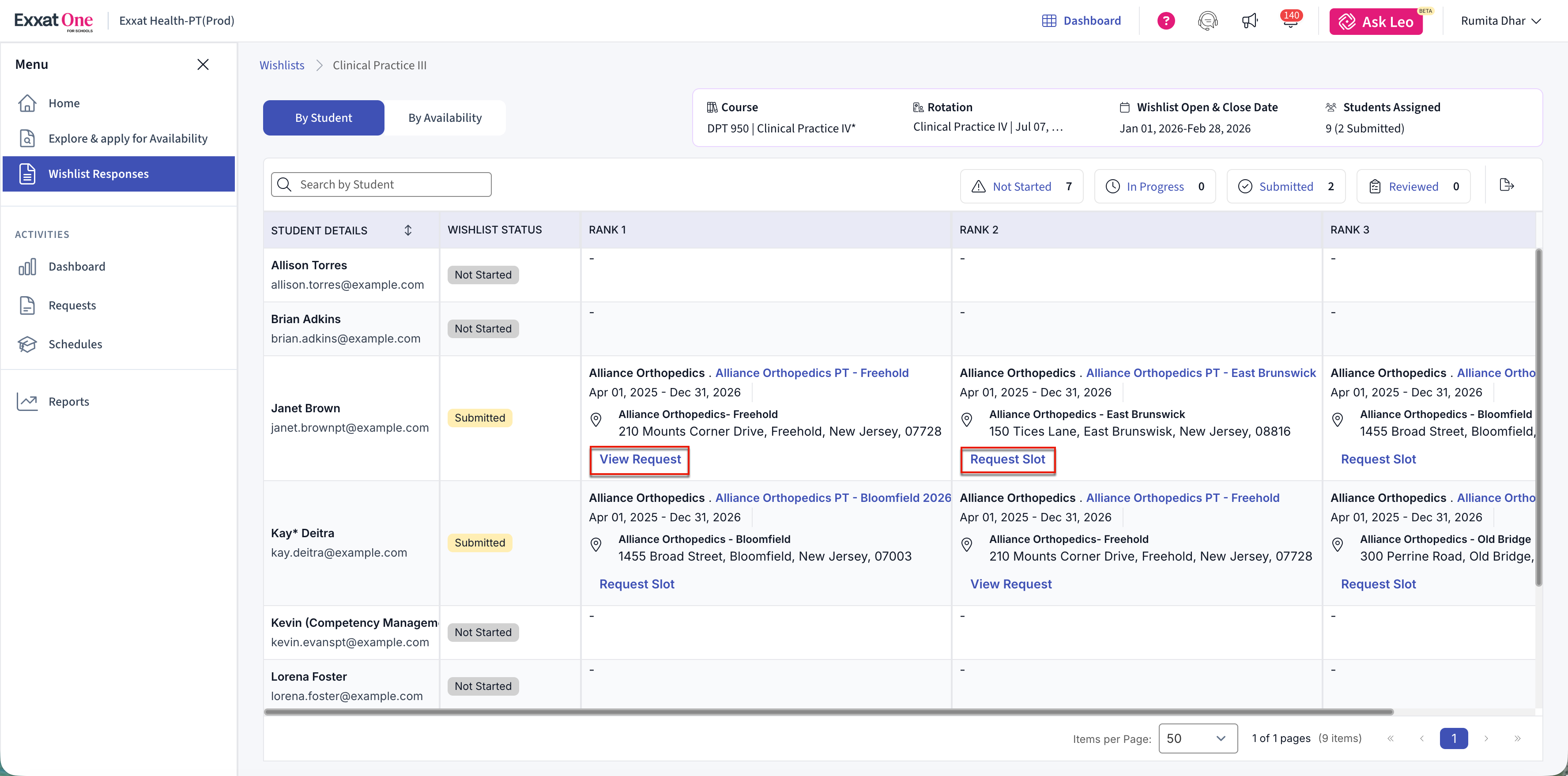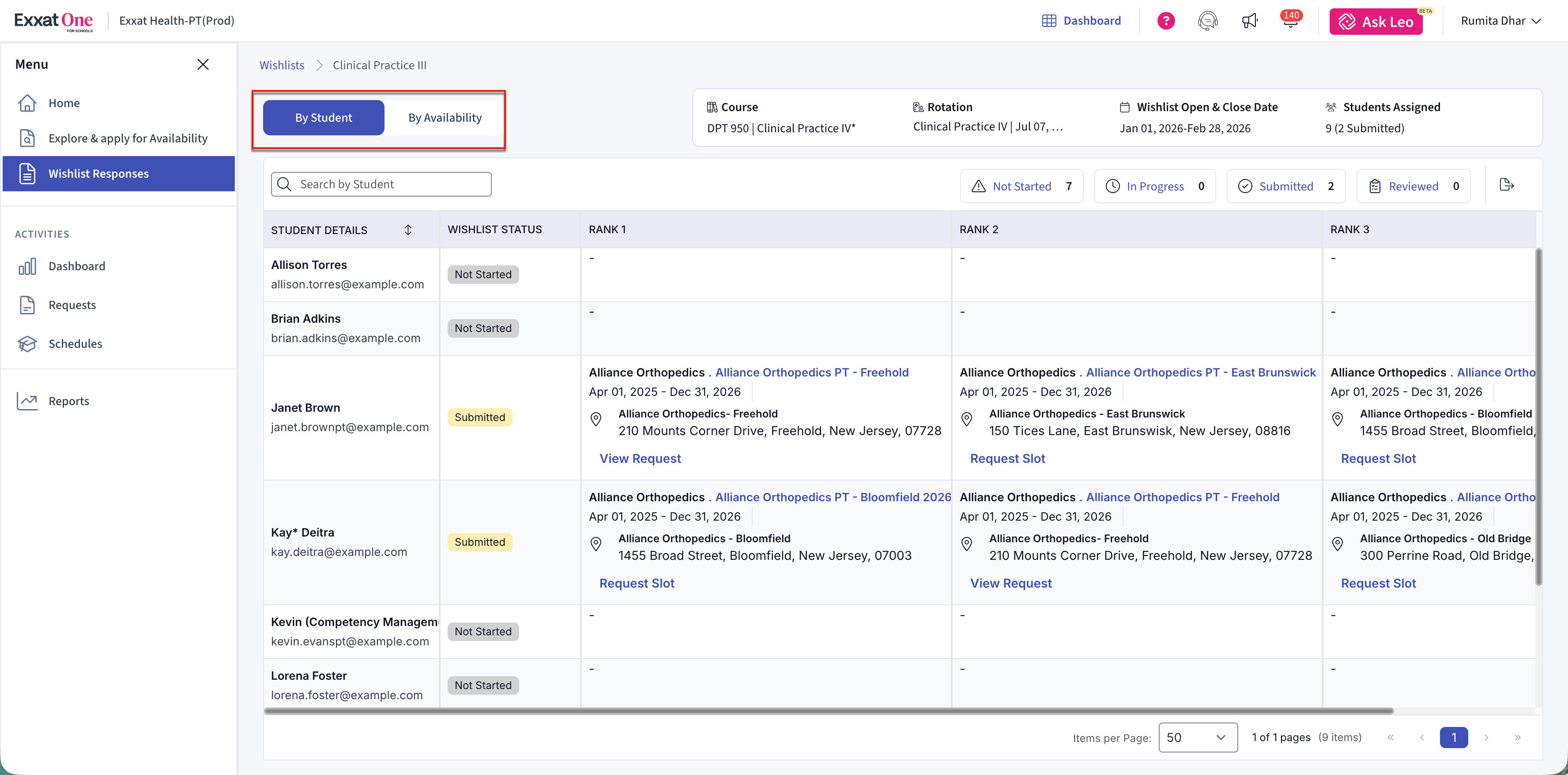 The Wishlist feature in Exxat One allows schools to review student placement preferences collected through Exxat One and use those preferences to make informed availability requests. Schools can track submission progress, review ranked preferences, and request slots directly from student-selected availabilities.
