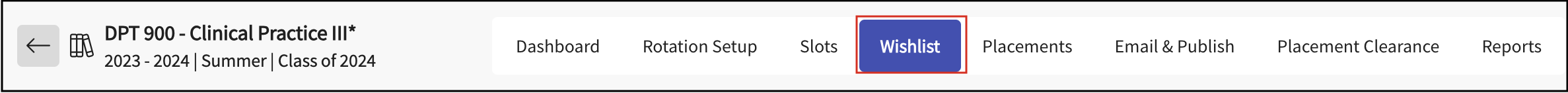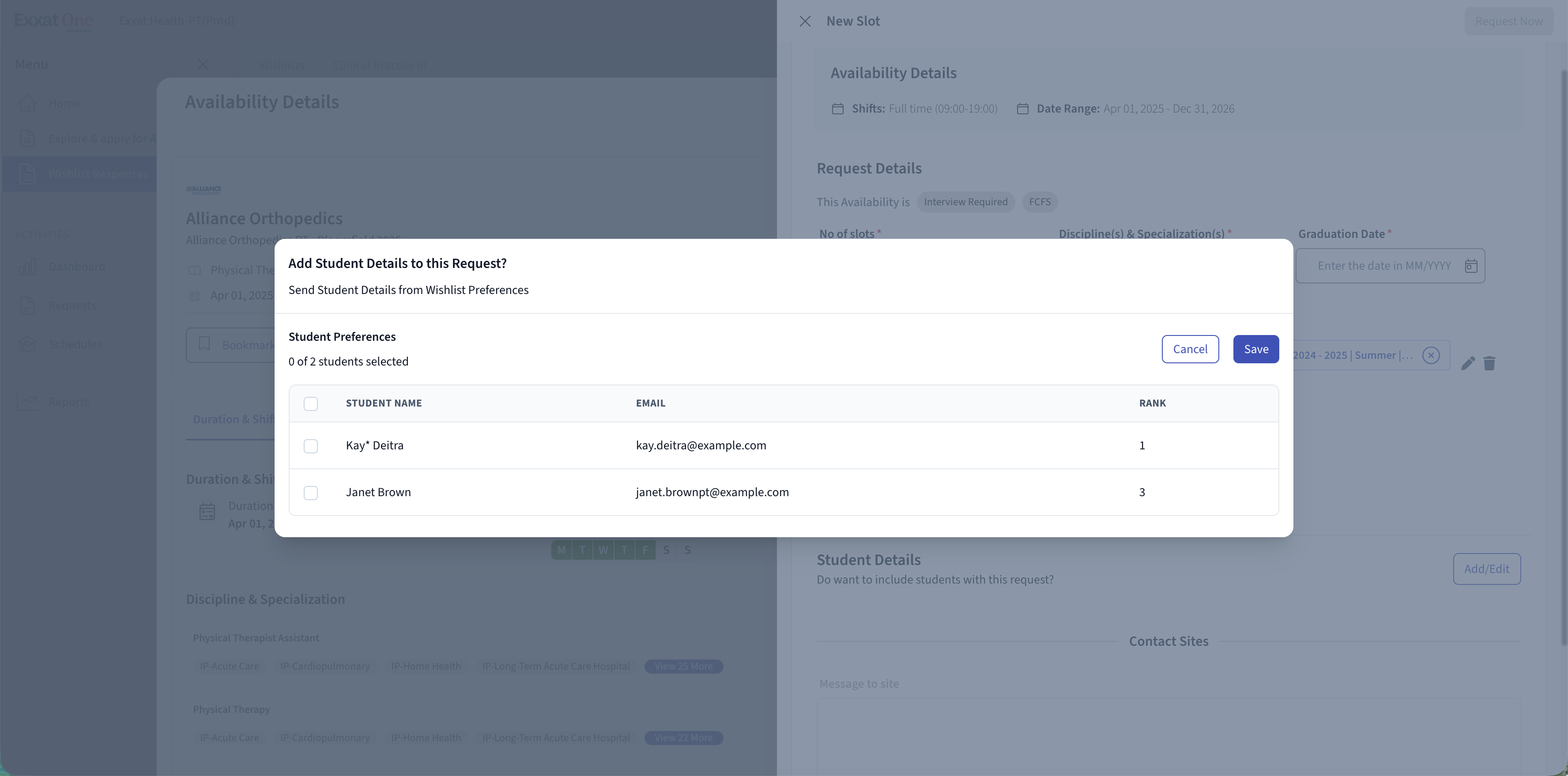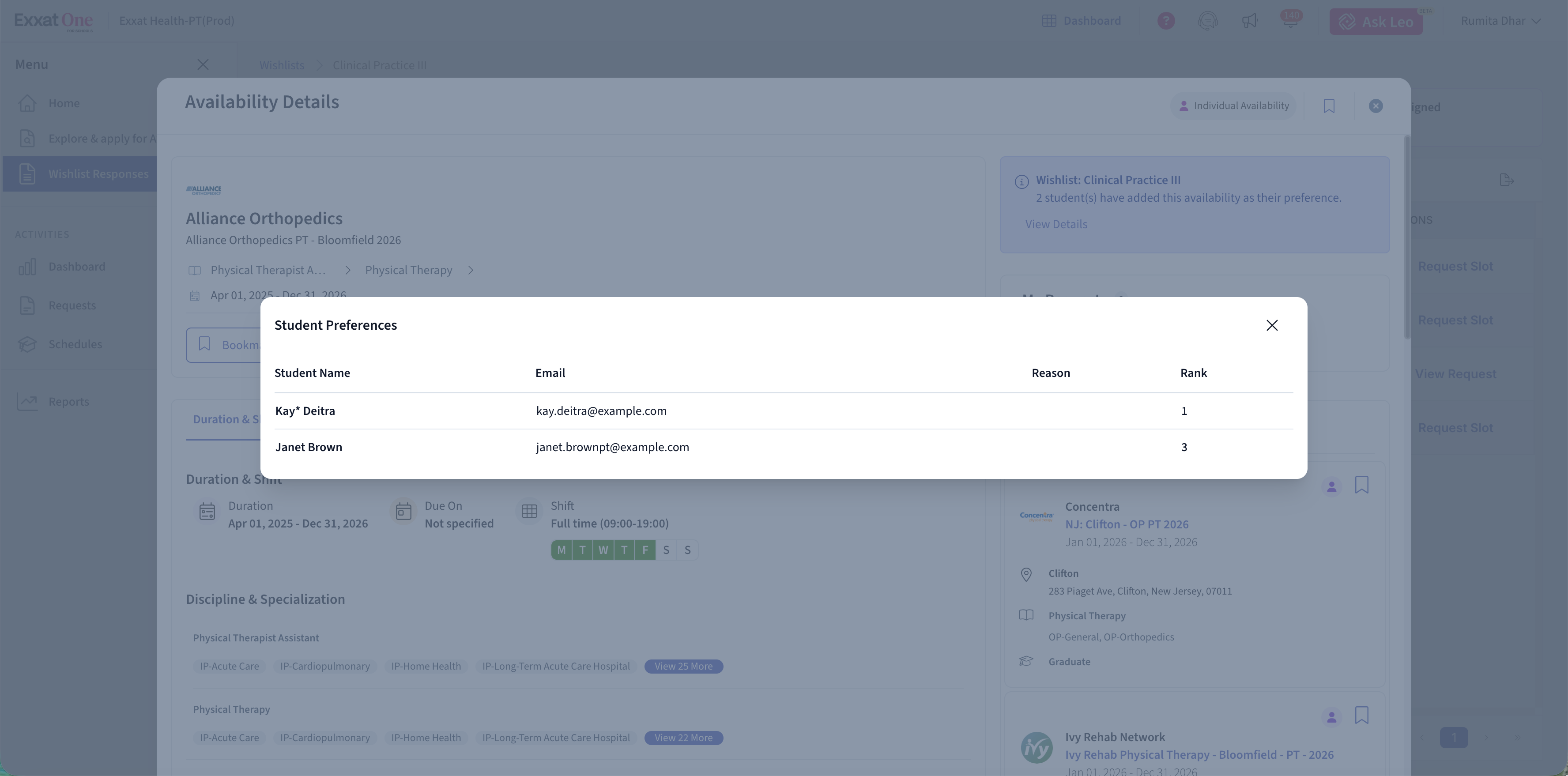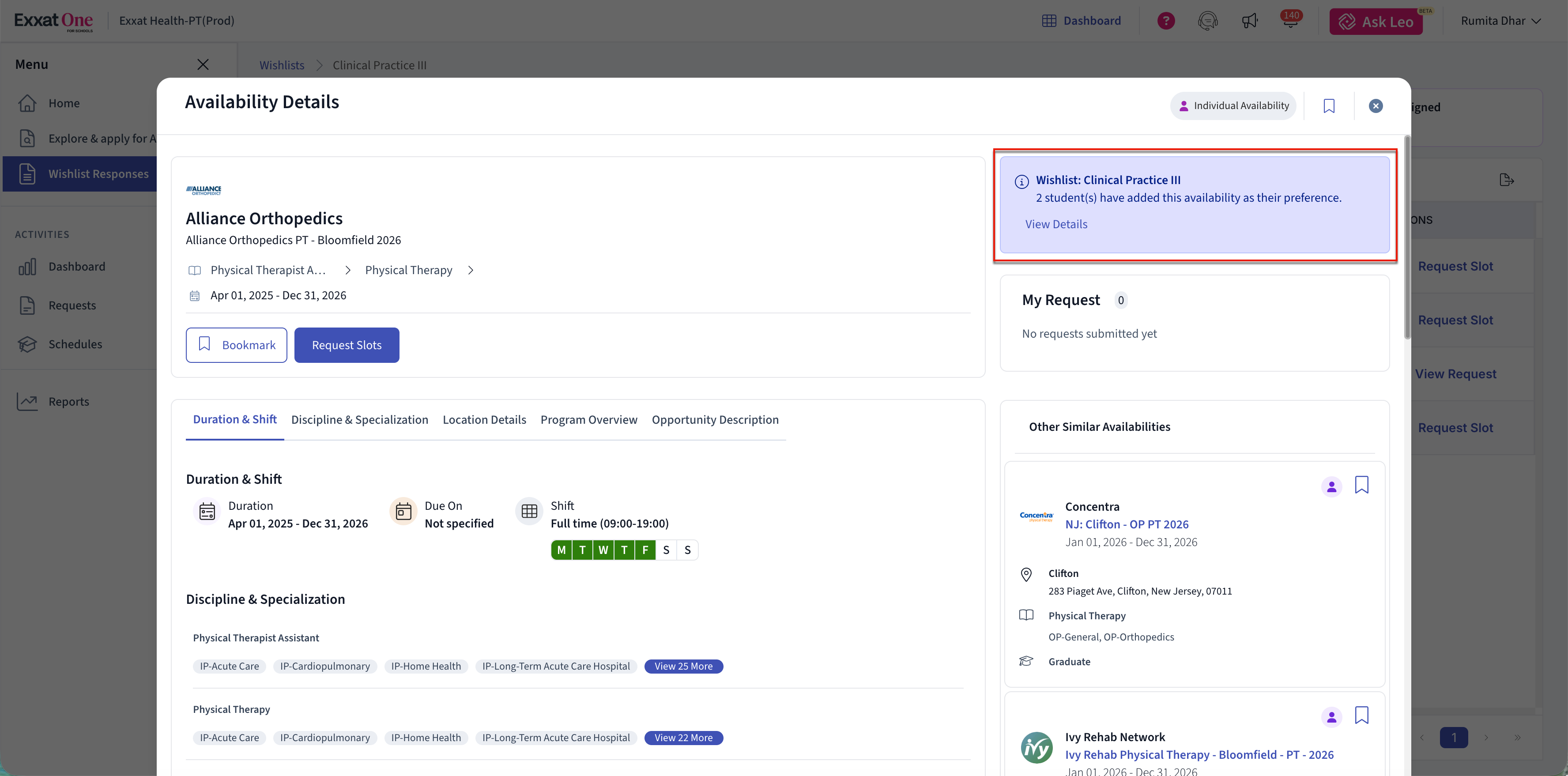 Note: Wishlist setup and configuration are managed in Exxat Prism. Exxat One is used to review student responses and request slots based on those responses.