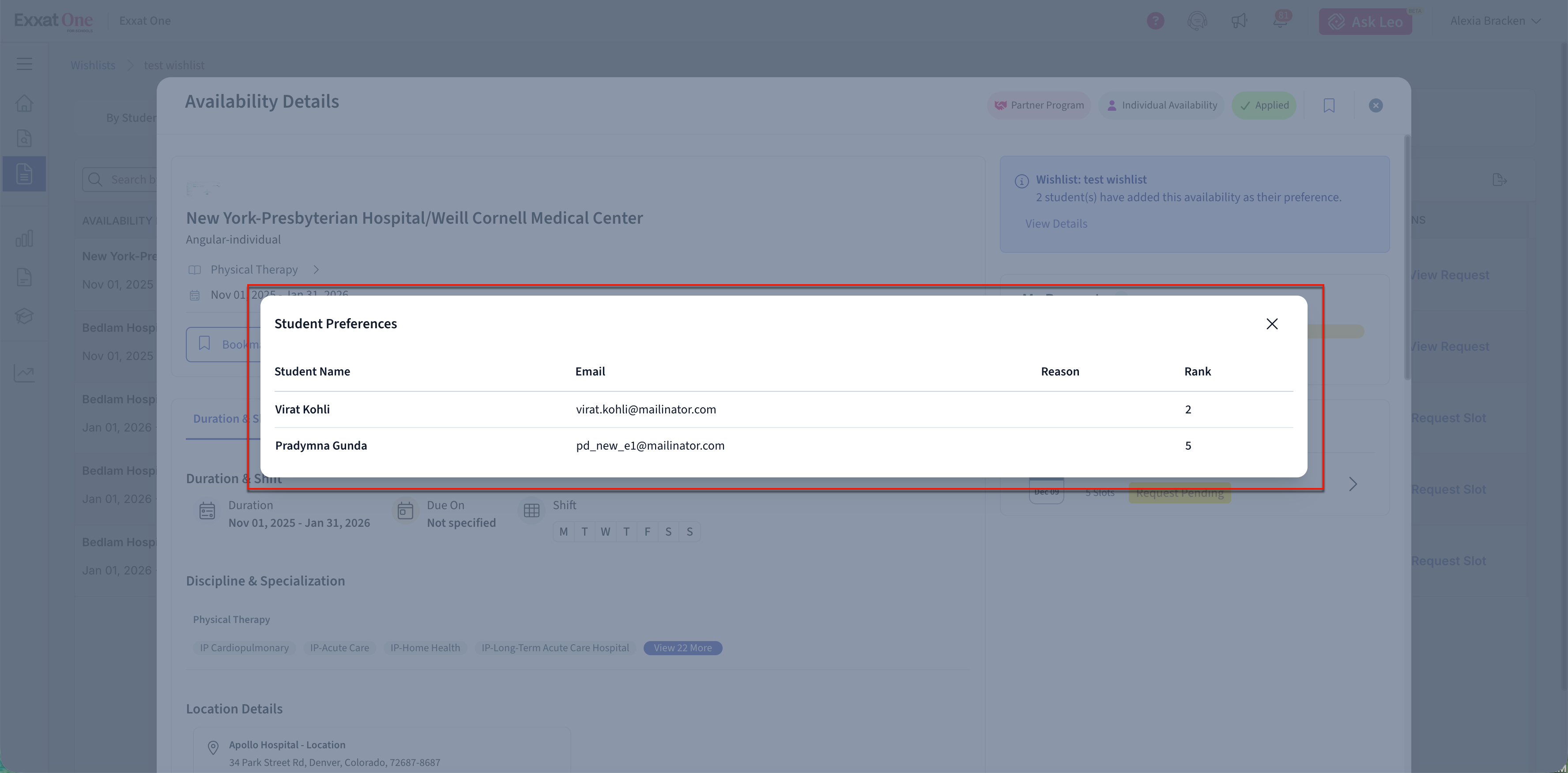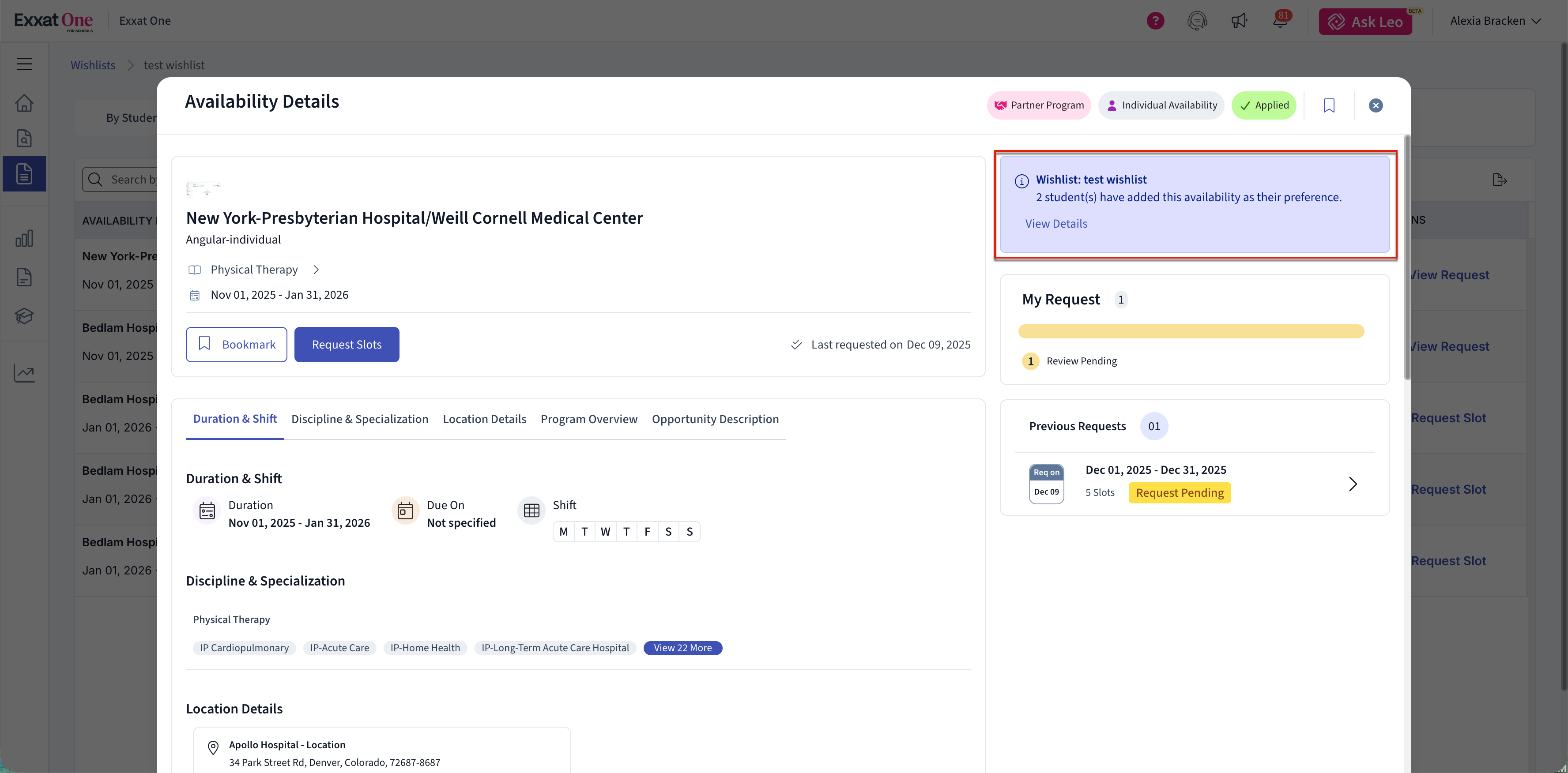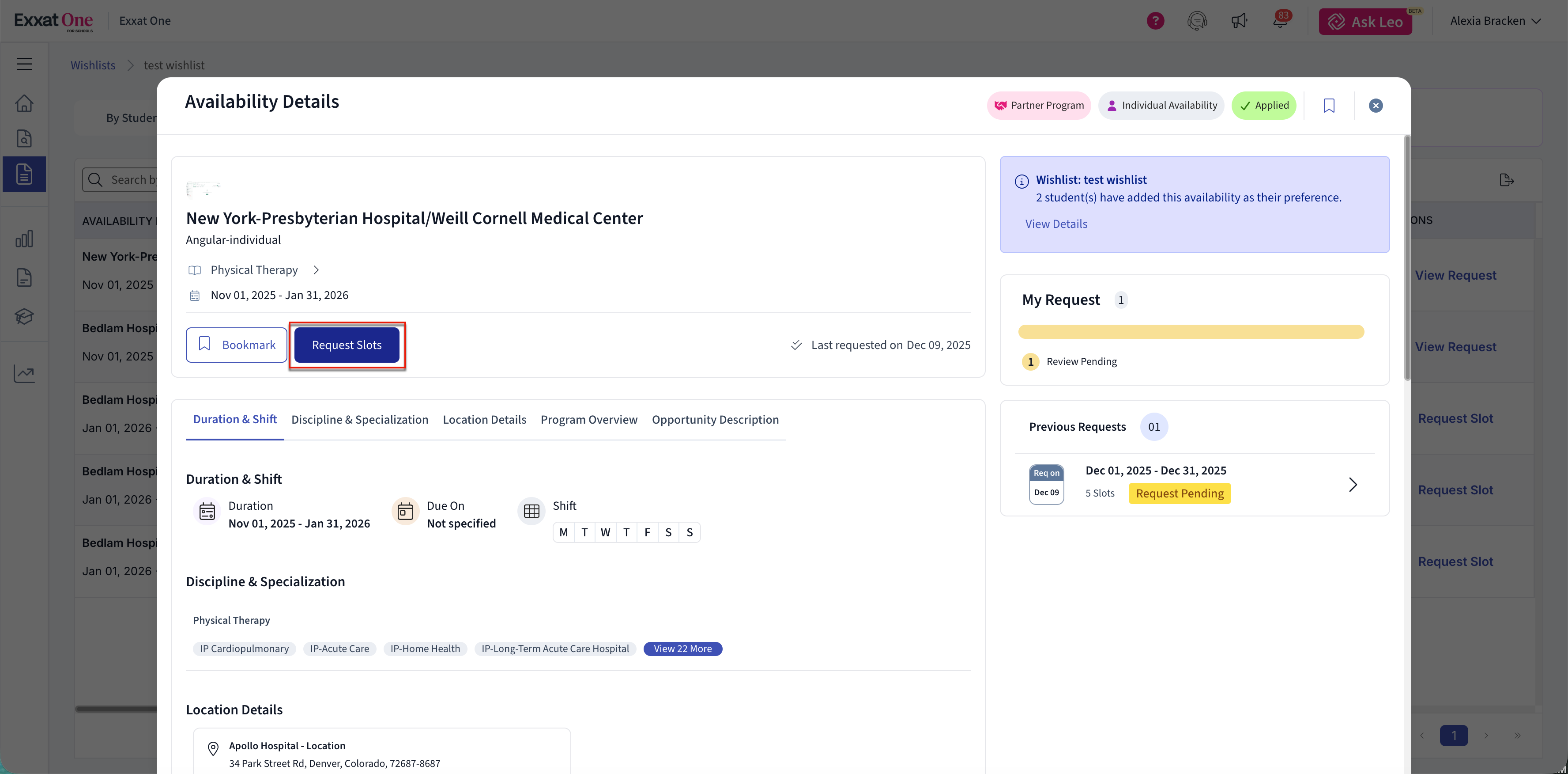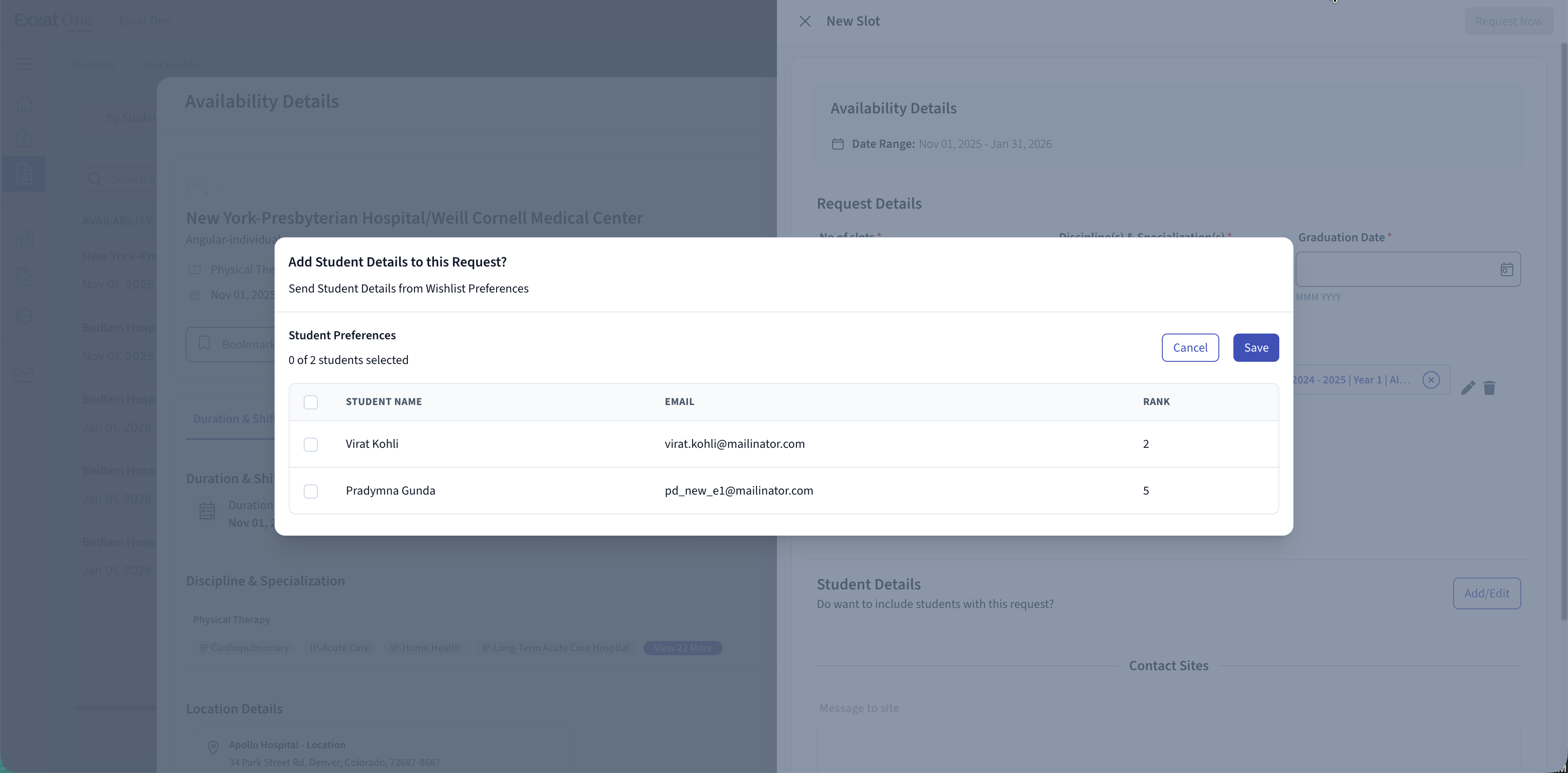 Note: Wishlist setup and configuration are managed in Exxat Prism. Exxat One is used to review student responses and request slots based on those responses.