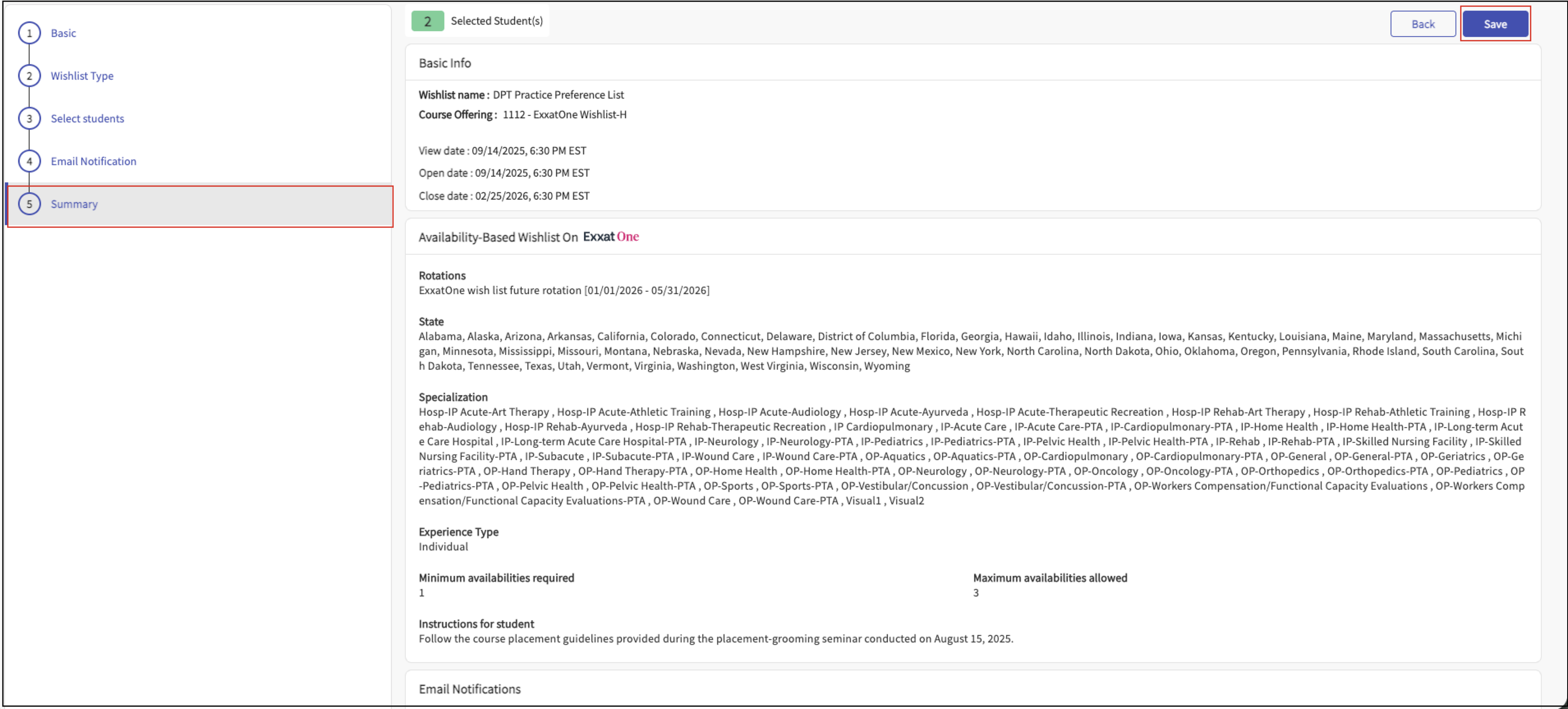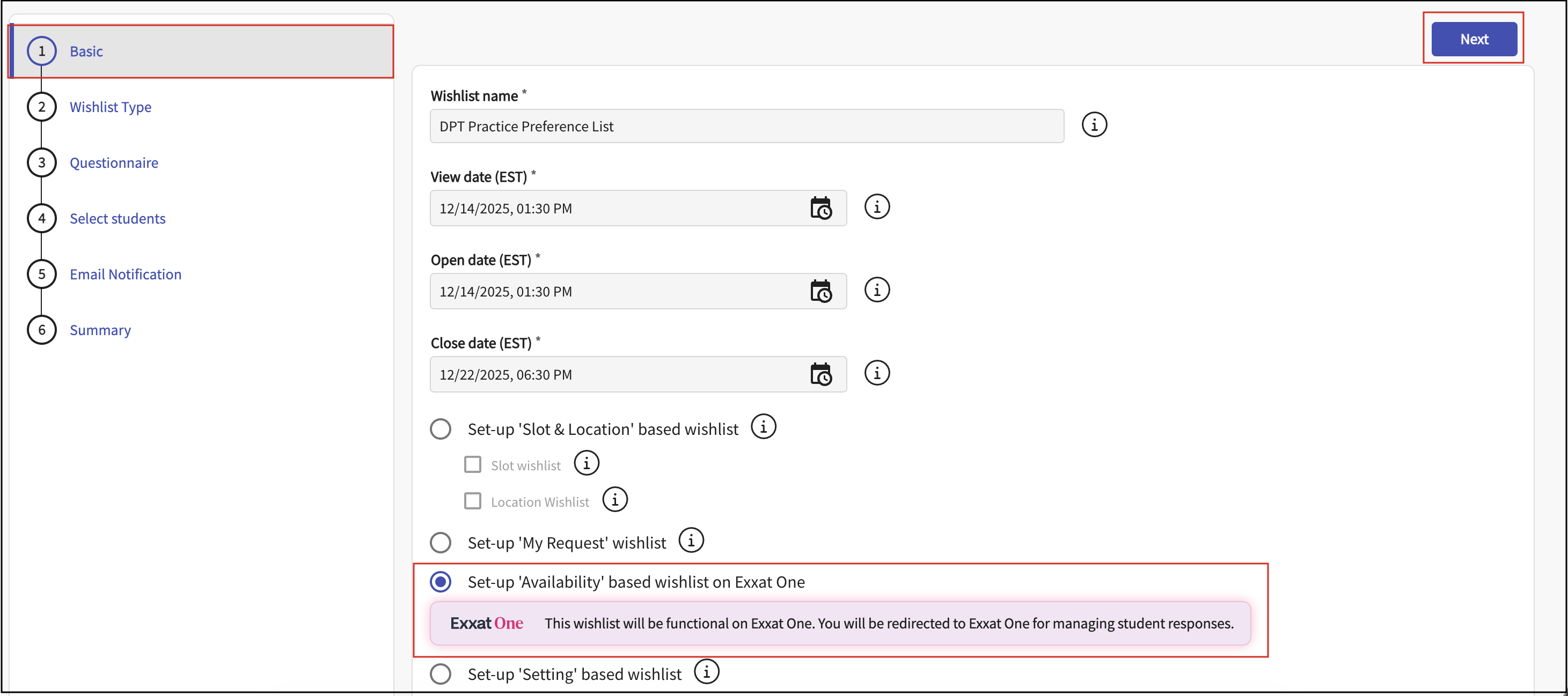 - Wishlists are created and configured in Exxat Prism, not Exxat One.