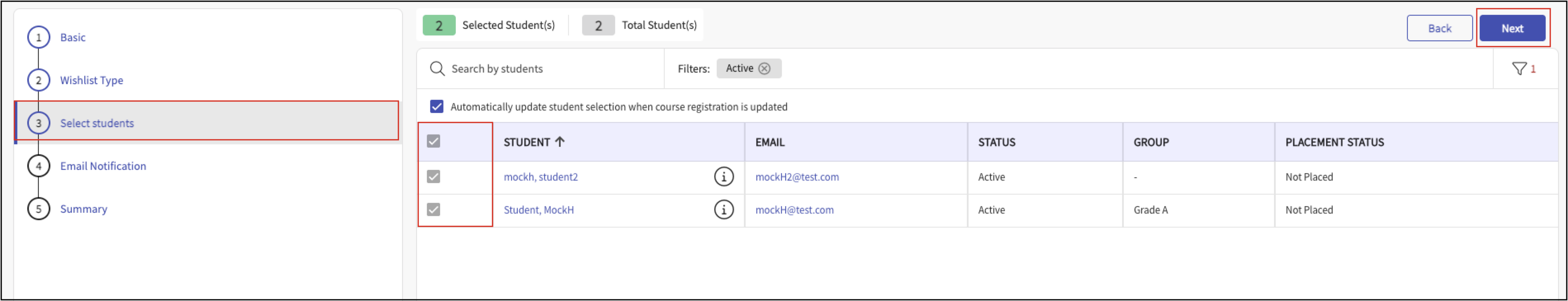 You can choose to update the student list when the course registration is updated. - Setup Email Notification for students and click Next.